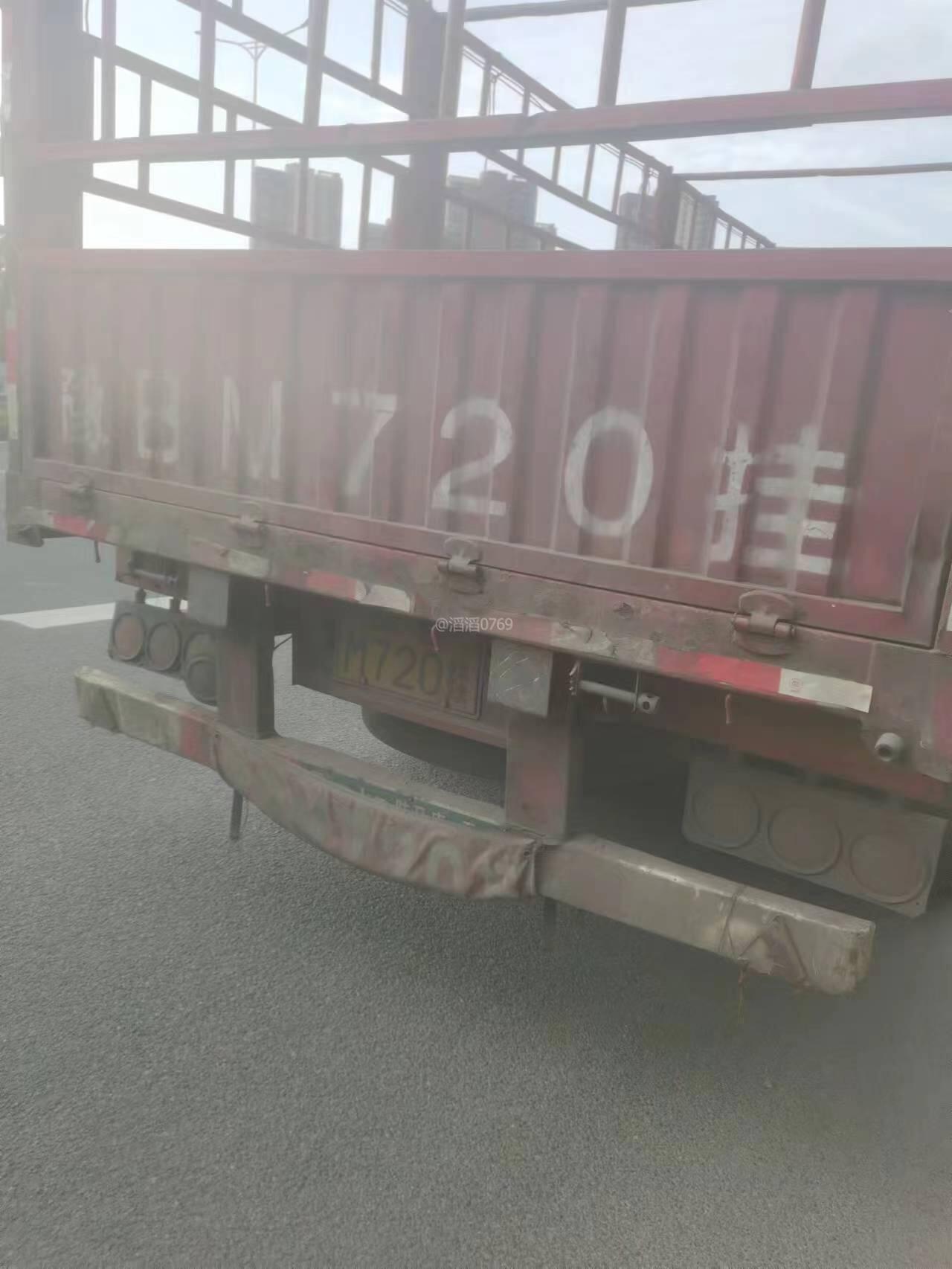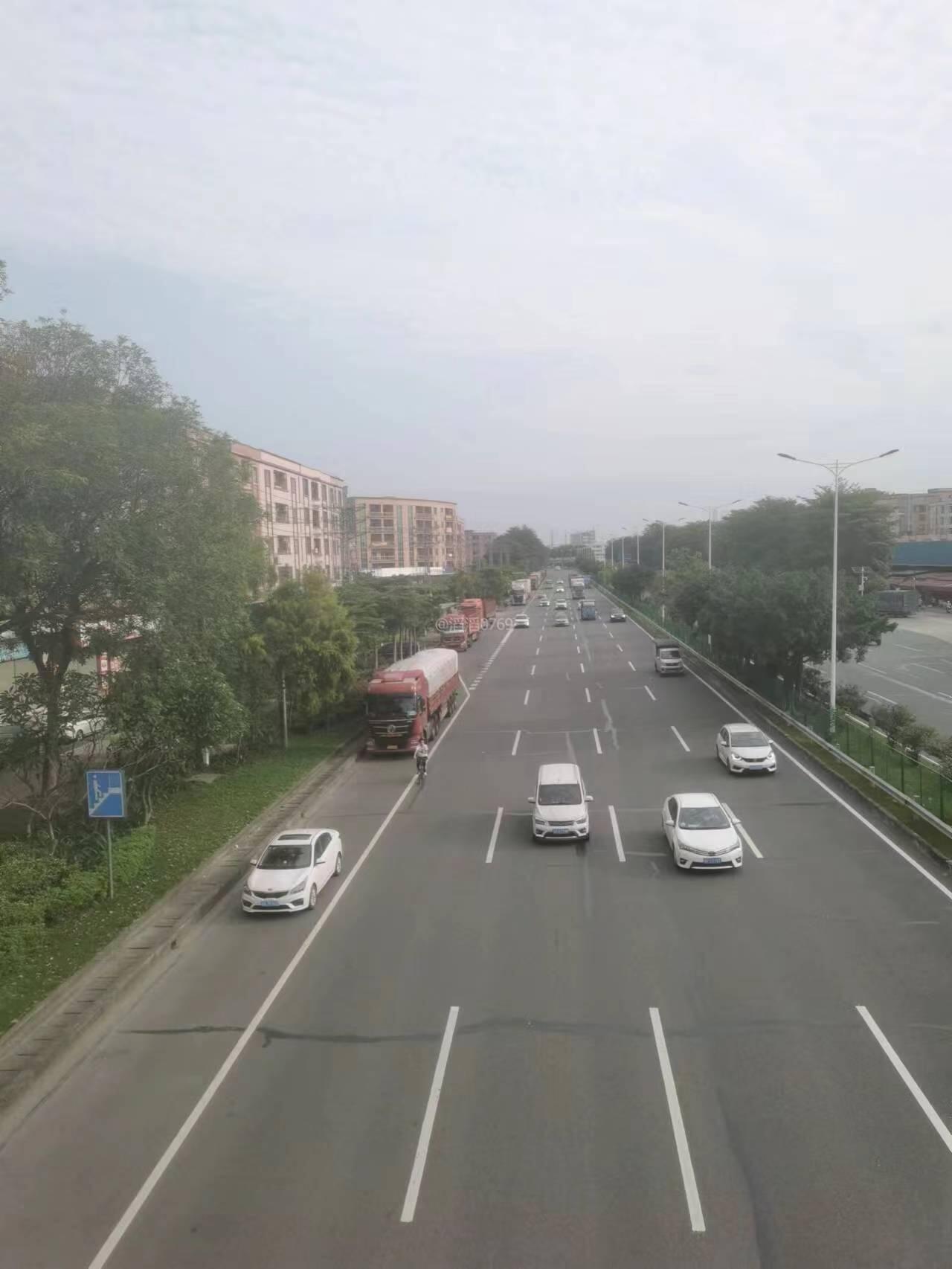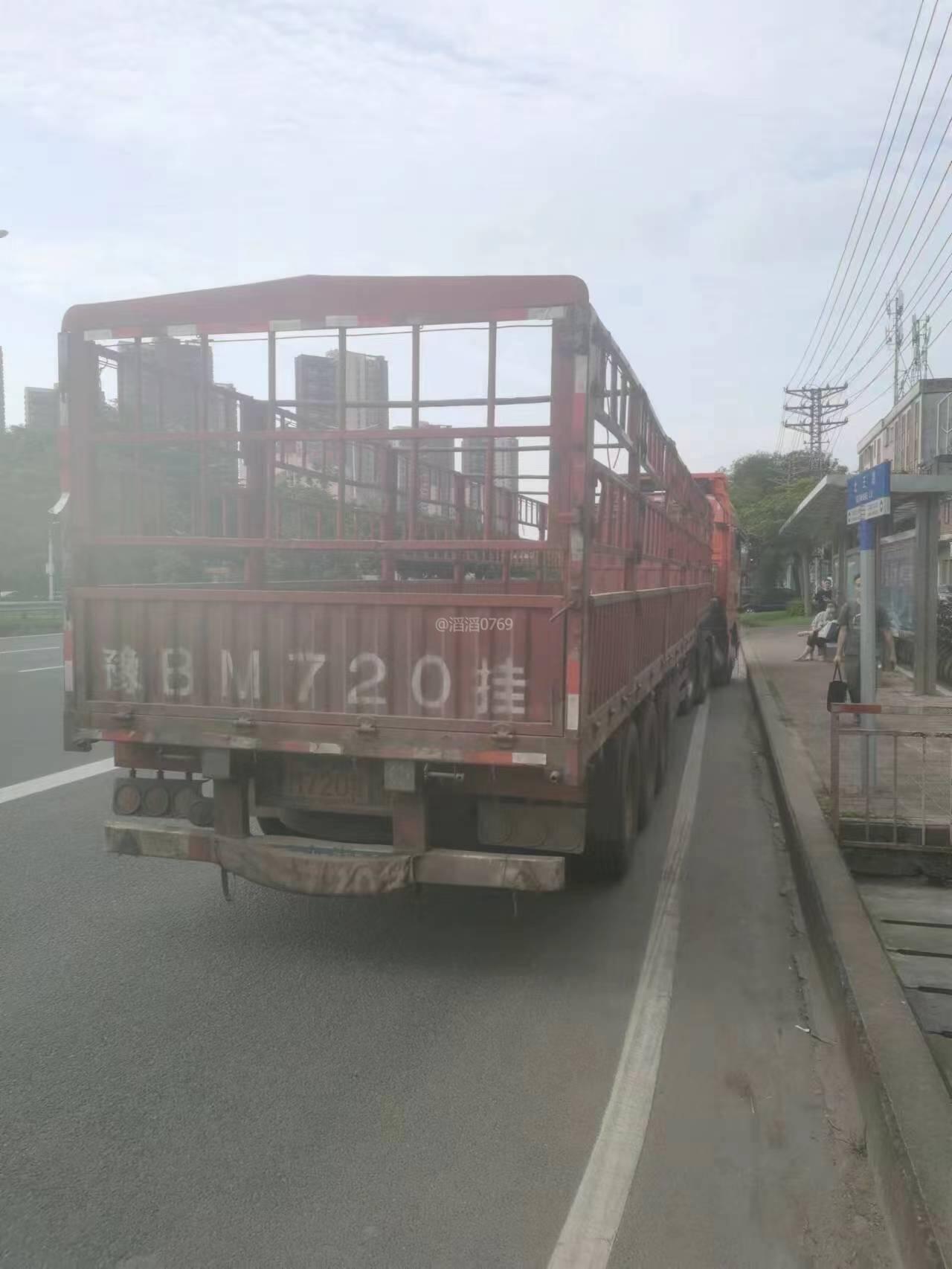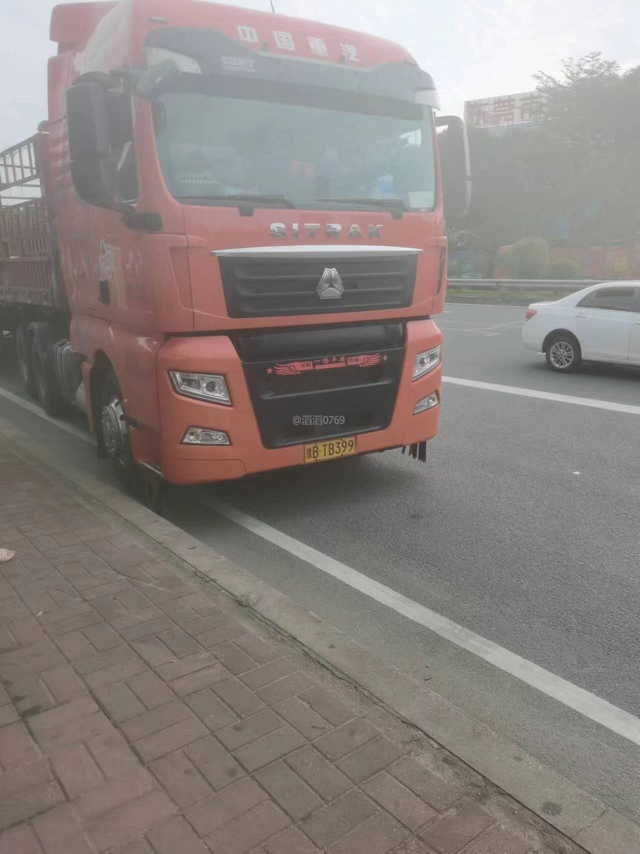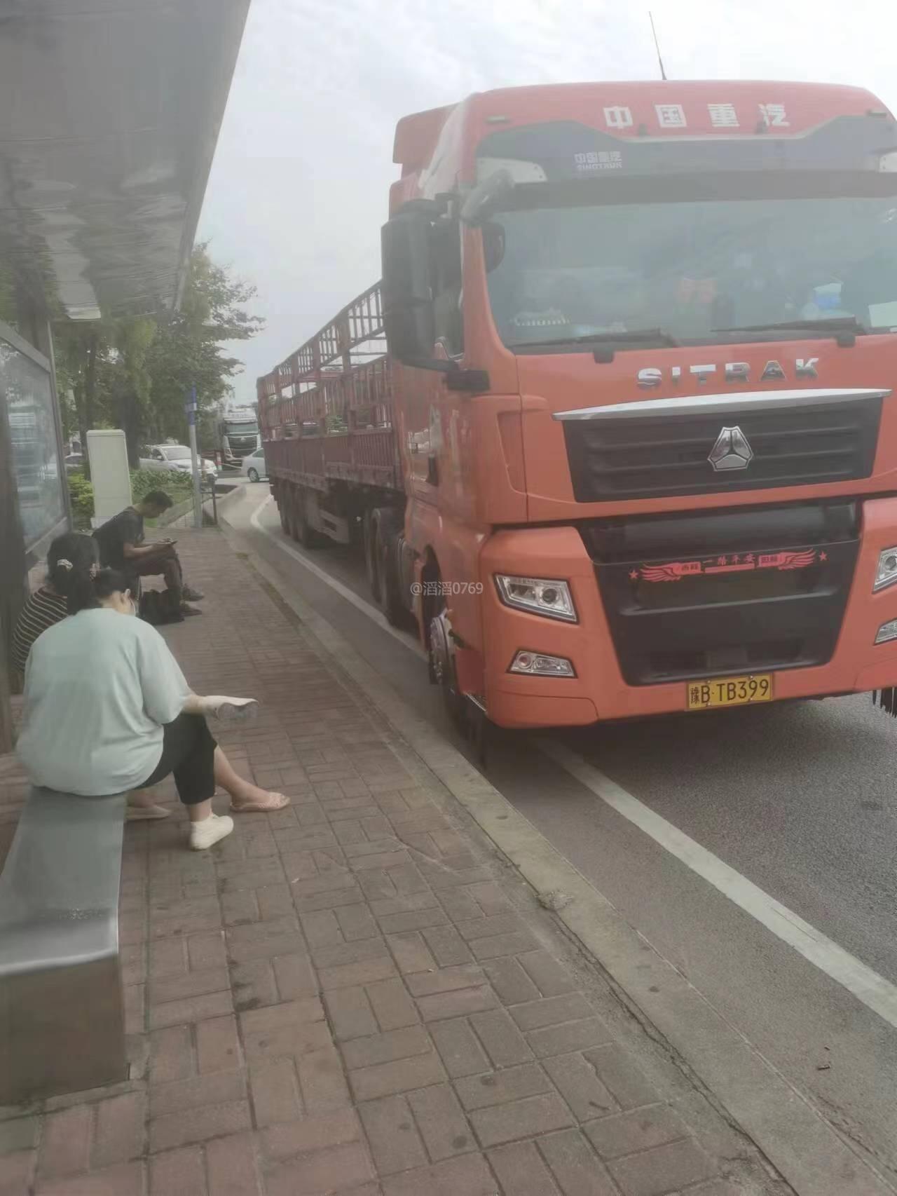 东莞市江南莞香水果市场的大货车在高埗镇冼沙村北王路路段乱停放