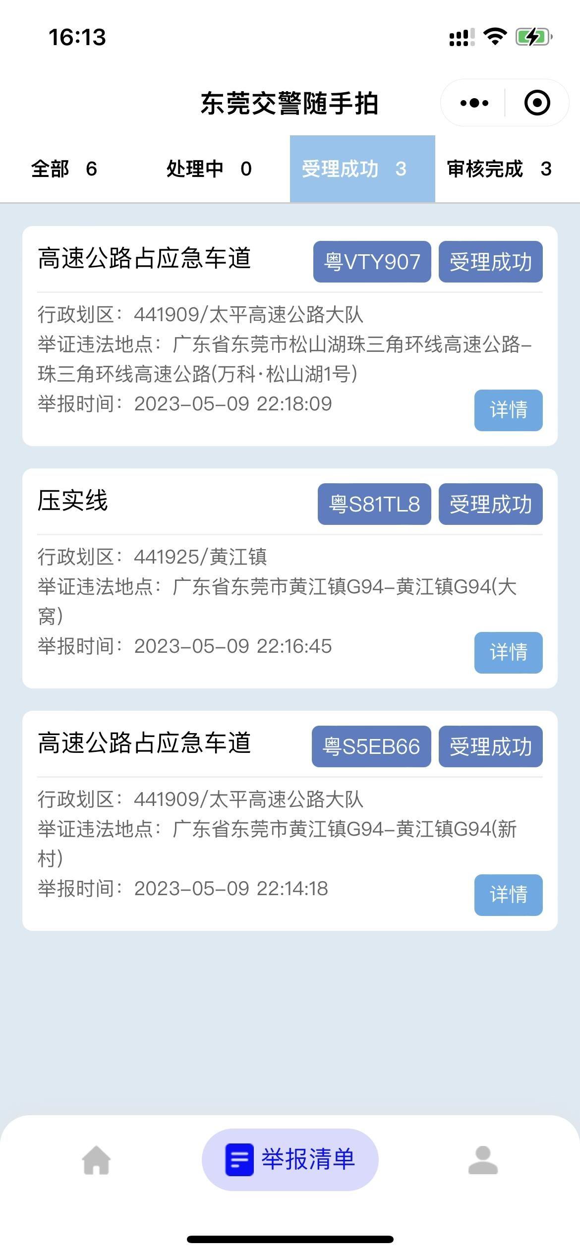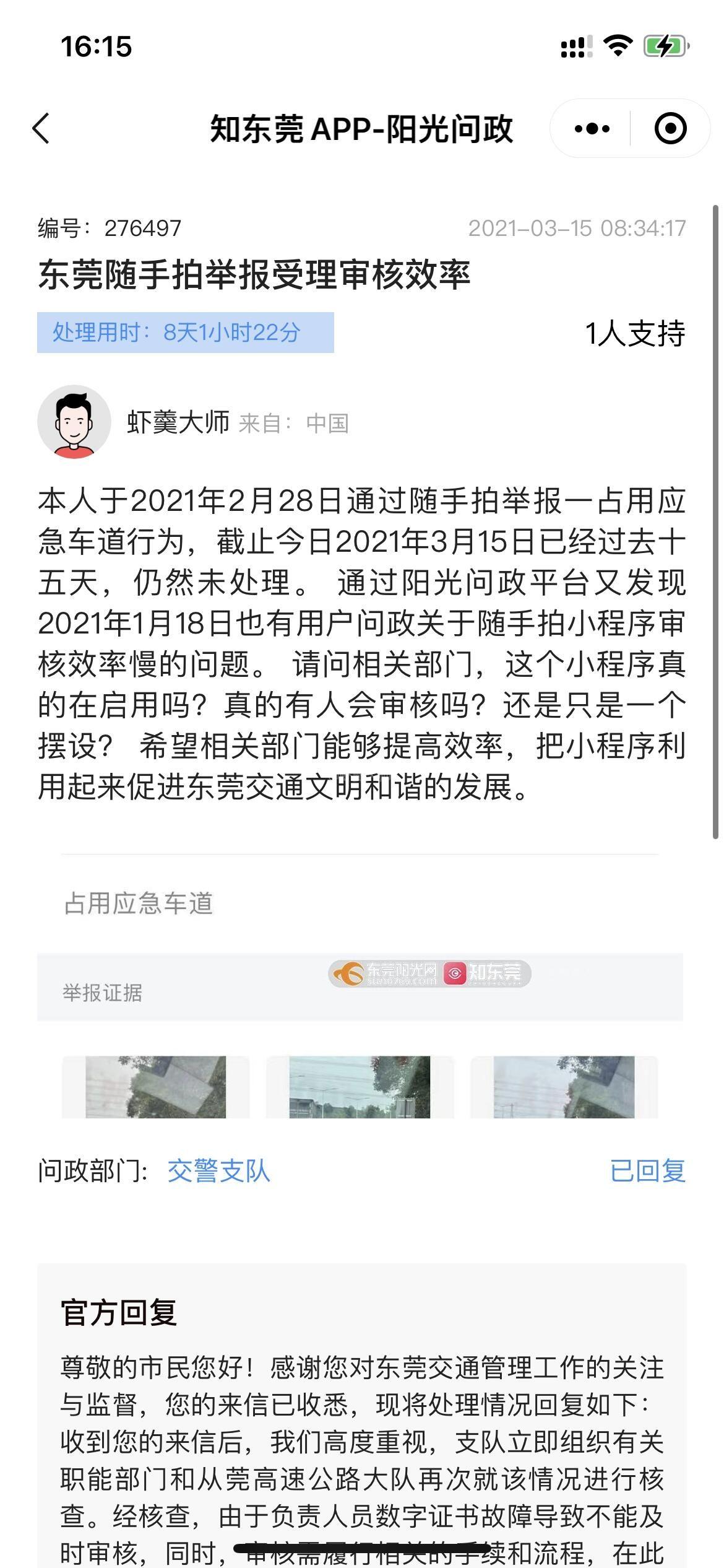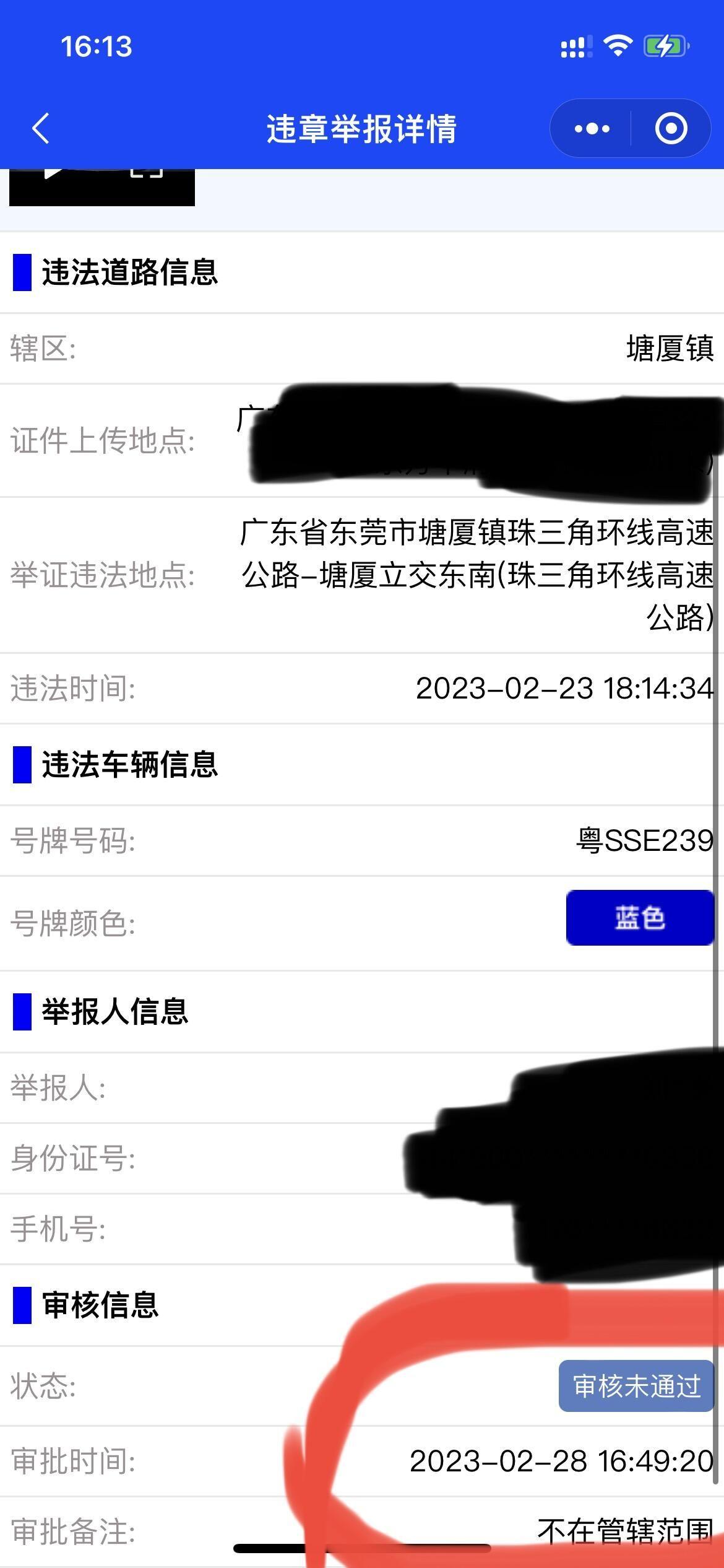 1、2月23日举报的跨实线变道,违章过程清晰,违章地点左侧水塔写着“发财特”位于塘厦,该高速交汇路口也是非常清晰。为何审核结果是“不通过”,并且给出的备注是“不在管辖范围”。请问塘厦镇不在东莞市吗?东莞交警对市内的位置没有管辖权?? 2、5月9日举报的三宗交通违章,今日25日都还没有处理,虽交通法规是写十三个工作日内要通知车主违章,还差一个工作日,但这个处理效率是否太低了呢? 3、2021年两年前已经反映过随手拍处理速度慢的问题,两年过去还是这个效率。 对于交通压力这么大的东莞,这个举报处理速度我觉得是非常不及格的,希望交警部门能够改进提升一下,还一个良好的驾驶环境给我们!!