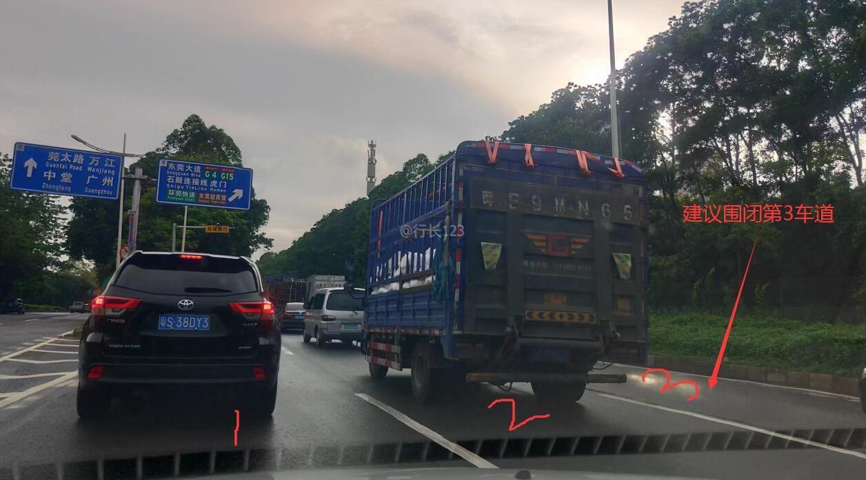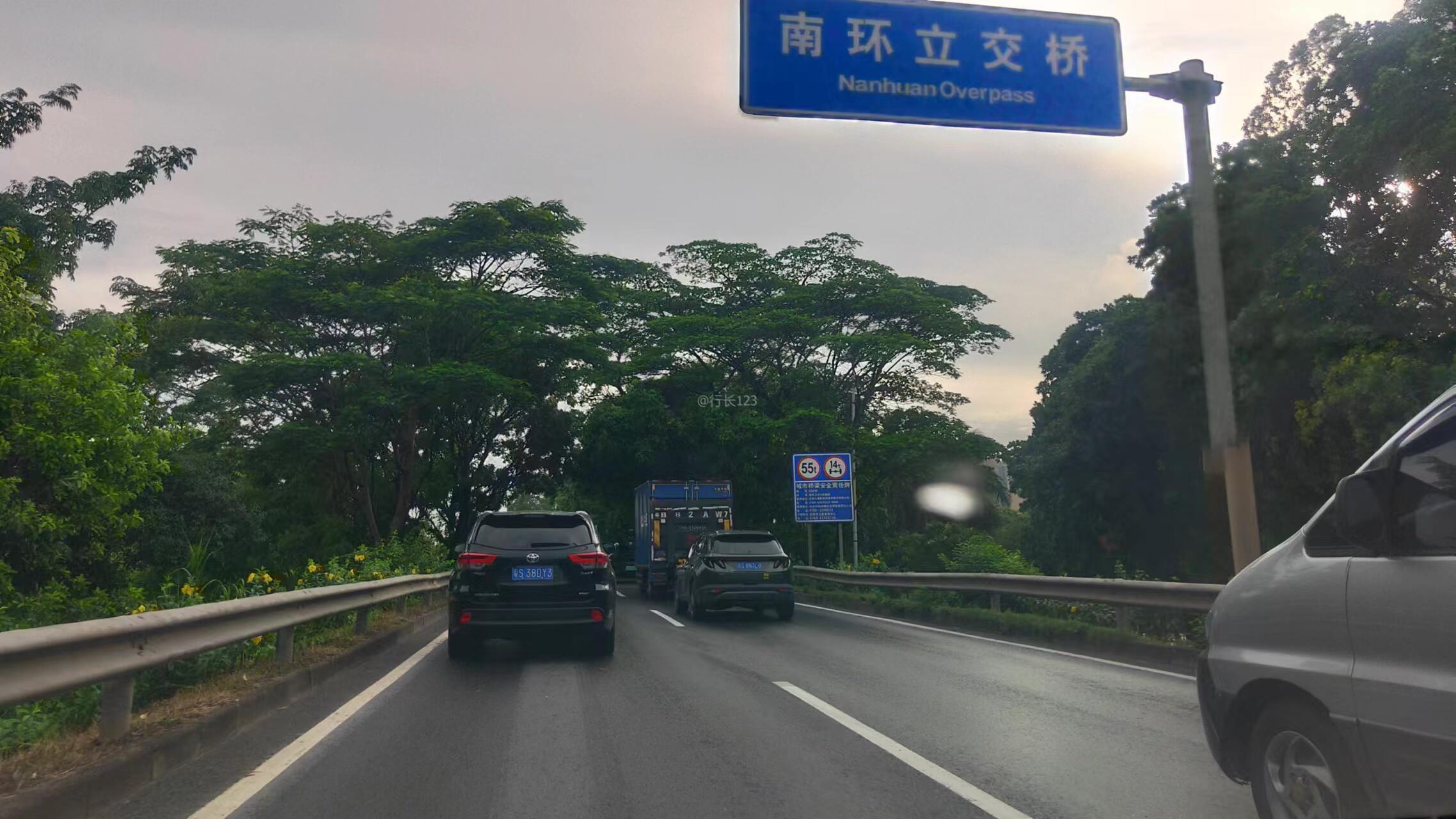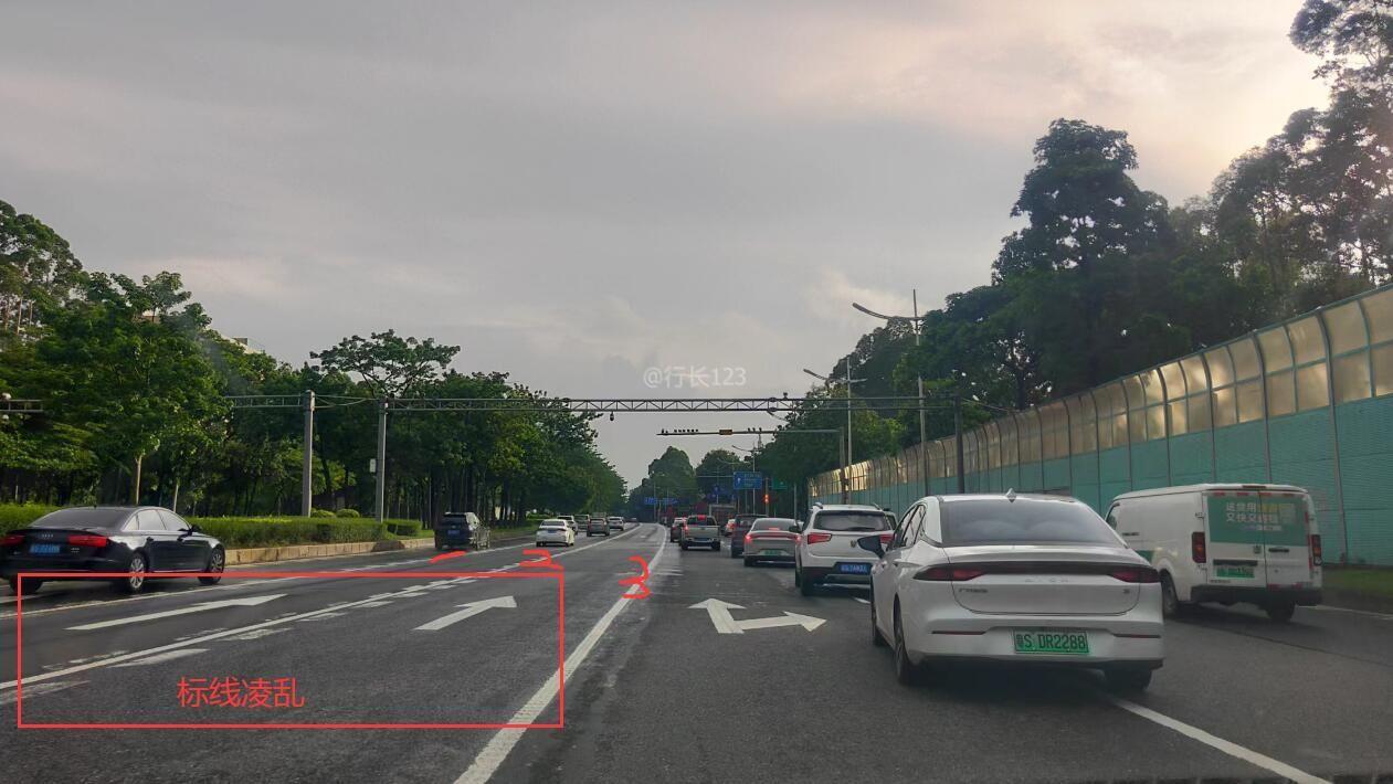环城南路入环莞快速口路段日常比较拥堵,建议用微治理方式调整路面标志标线等以解决拥堵。建议如下: 1、入口前路段标线比较凌乱、复杂(图2),实线比较多,容易误导行驶,建议将图2的第1、2条实线变为虚线,将第3条实线改为道路出入口标线,方便驾驶人辨别出入口,同时相应的地面箭头需修改。 2、临近环莞快速口有3条车道(图3),建议试一下用反光锥或水马封闭整条第3条车道,一直封到南环立交桥,原因:南环立交桥往环莞方向只有2条车道,而这段路由3车道变2车道,造成临近南环立交桥时车辆就比较乱,形成一个瓶颈,车辆就出现打占行为,造成车辆行驶缓慢,然后导致后面的车长时拥堵。如果封闭第3车道改为2条车道,入口2车道对应南环桥2车道,那车辆就不存在打占,走走停停等行为了,让车辆更好快速通过。 3、图4是南环立交桥2车道。 建议交警部门尝试此方案!以解决交通拥堵。