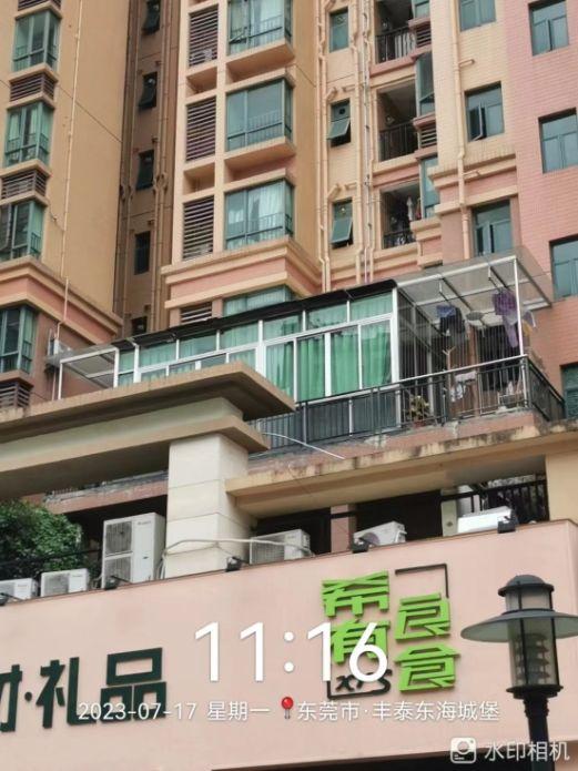 尊敬的市民,您好!你反映的问题已收悉,现回复如下:接投诉后,我分局于2023年7月17日派出执法人员联同物业管理人员到虎门镇赤岗社区丰泰东海城堡勘查,经查两处建筑物分别为东海城堡13栋3单元302、13栋2单元302,两间房屋均在公共平台处搭建一层玻璃房,因该平台属小区公共空间,对于物业小区范围的擅自占用、改建物业共用部位、共用设施的,该行为已违反了《广东省物业管理条例》第五十五条第六项相关规定,依据《广东省物业管理条例》第六十八条第四项的有关规定,应由房地产主管部门查处,分局将函告房地产管理局、住建局。执法人员现场向物业管理人员发出《关于加强违法建设行为监管的告知书》,要求物业管理人员对所在管理范围内建筑物加强监管,我分局将继续加强巡查。如有城市管理方面的问题,可致电分局24小时值班电话:89328222或通过微信公众号“东莞城市管理”进行反映。 感谢您对城市管理工作的监督与支持!