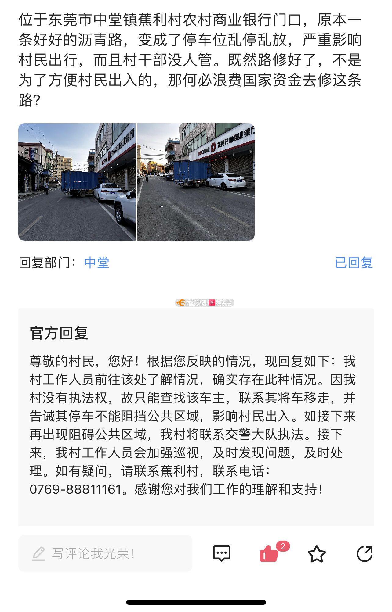 位于东莞市中堂镇蕉利村农村商业银行门口,原本一条好好的沥青路,变成了停车位乱停乱放,严重影响村民出行,而且村干部没人管。既然路修好了,不是为了方便村民出入的,那何必浪费国家资金去修这条路?