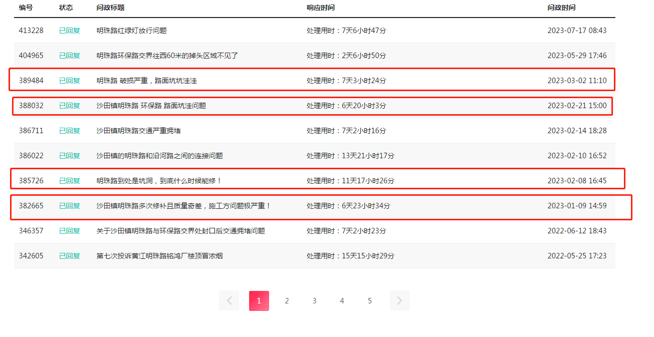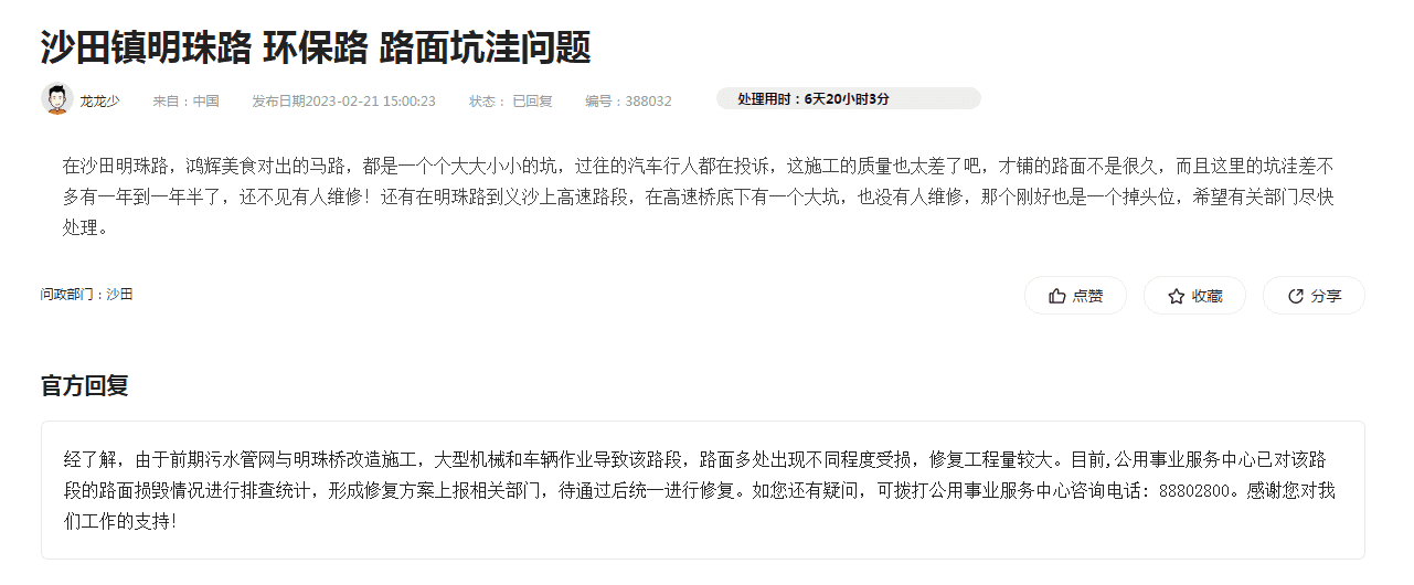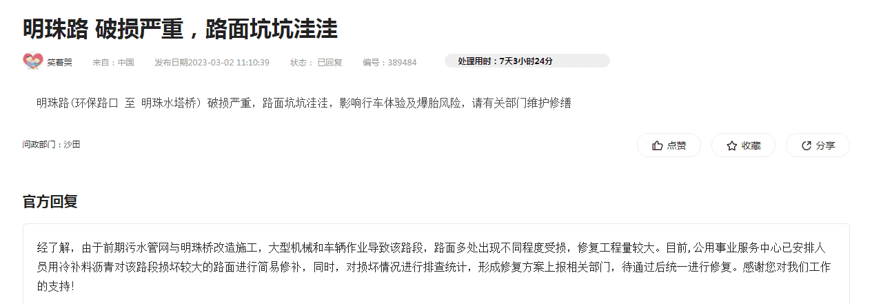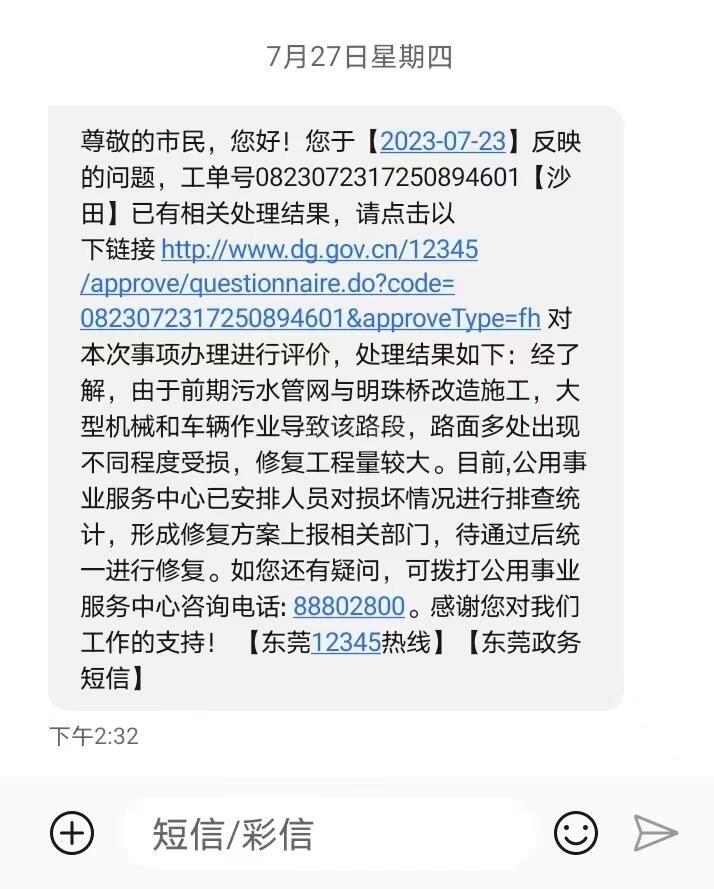 市府办的工作人员好: 实在没办法只能向你们反映问题,我是新莞人,在东莞沙田镇西太隆工业区上班,这边有一条明珠路:鸿辉美食——西太隆水闸前面的公路桥路段(见图1),双向,注意是双向,路面多处开裂、坑洞遍布,非常损车,很多车主在此处爆胎!更危险的是夜晚,骑电动车的人们因为光线不足或没注意,被坑洞掀翻在地,摔的头破血流,周边是疾驰的车流!(就是我同事,我对我的话完全负责)针对这个问题,很多人不知道怎么去投诉,只有少数人知道打12345或在阳光问政申诉,路面损毁已经有两年,沙田公用事业中心的人,接到投诉后就会打给投诉者,回复:已安排人员用冷补料沥青对该路段损坏较大的路面进行简易修补,同时,对损坏情况进行排查统计,形成修复方案上报相关部门,待通过后统一进行修复。 说的多好听啊,从2023.2月份他们就这么回答,到了2023.7月份,整整5个月后还是这么回答(见图2),但路面开裂和坑洞完全没有修补,5个月前什么样,现在还是什么样!我对我的话完全负责,你们现在就可以去现场查看,我有阳光问政截图证据(见图3),他们当时明确说修补了,后续会继续统计问题,彻底修复,其实根本没有,一丁点都没补,根本不在乎人民死活!这种公然敷衍、公然撒谎,必须给生活在周边的工厂、企业和劳动人民一个交代!我对沙田公用事业的人彻底没信心了,他们根本不怕投诉,每次都是敷衍不行动,撒了5个月谎,请问还要继续多久?道路坑洞到底修不修?到底有没有哪怕一点与人为善的初心?