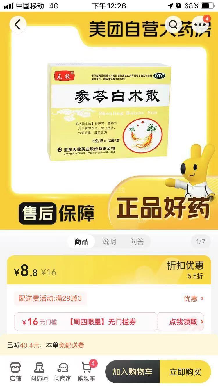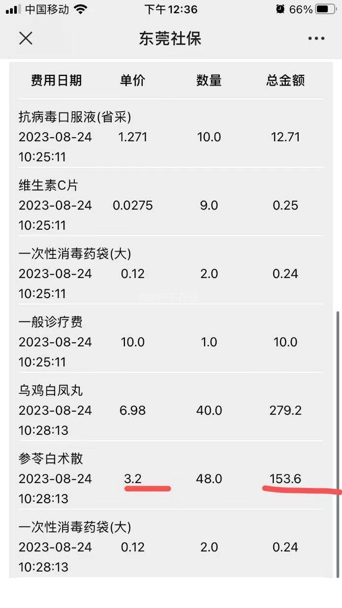 领导你好,我在社区医院开了四盒参苓白术散,显示药单价3.2一袋,一盒十二袋,折算一盒38.4元。上网一查,同样牌子同样规格,只要9.45一盒(京东大药房),美团自营药房更便宜,只要8.8一盒。折算是0.7-0.83一袋那样。虽然医保有报销,我实际支付金额不大,但个人认为社区这个药跟外面药房差价大的离谱。 药名:【克极】参苓白术散,6克*12袋一盒。 医生给我开的是图三。社区医院药品价格在图四。