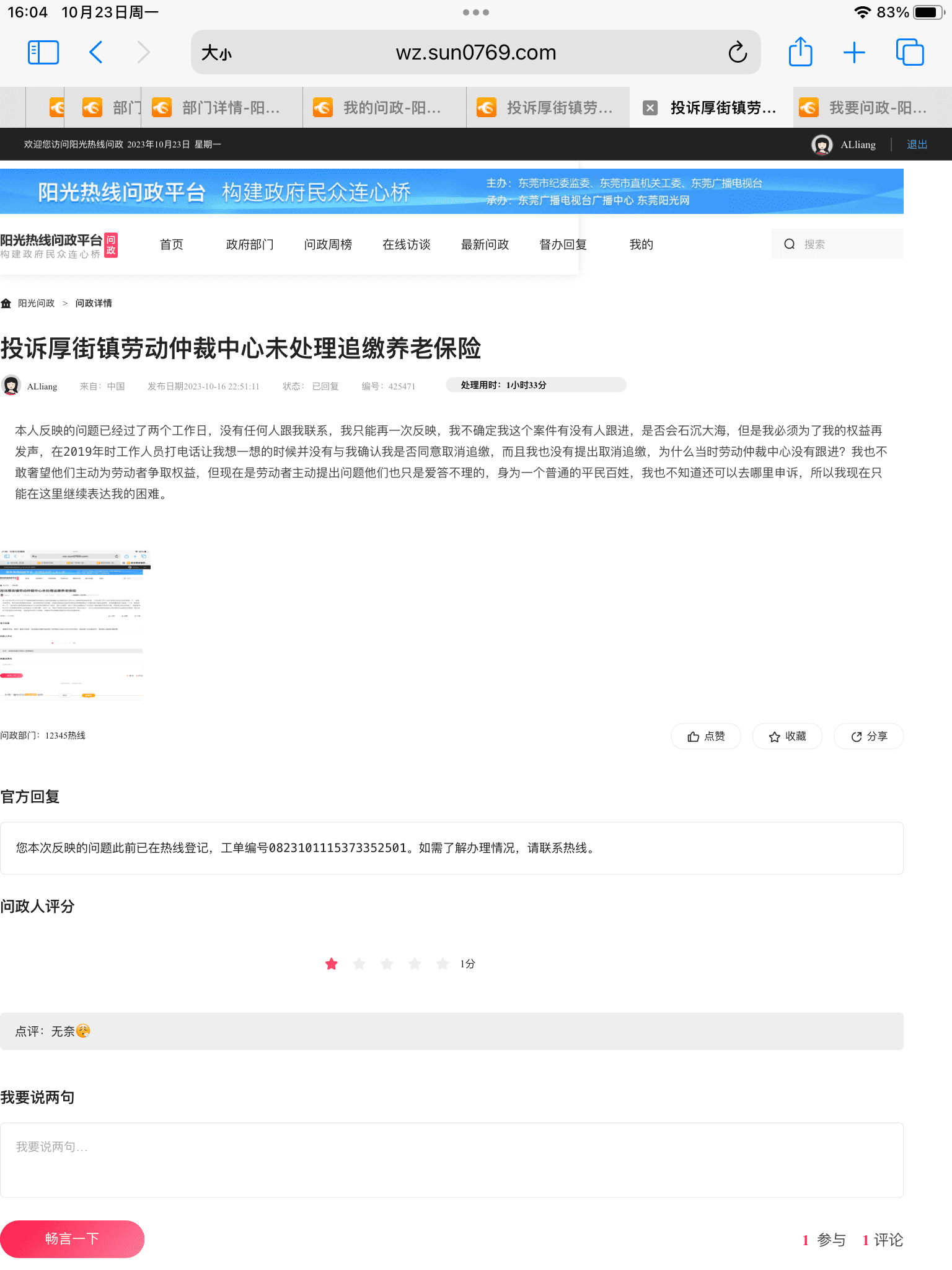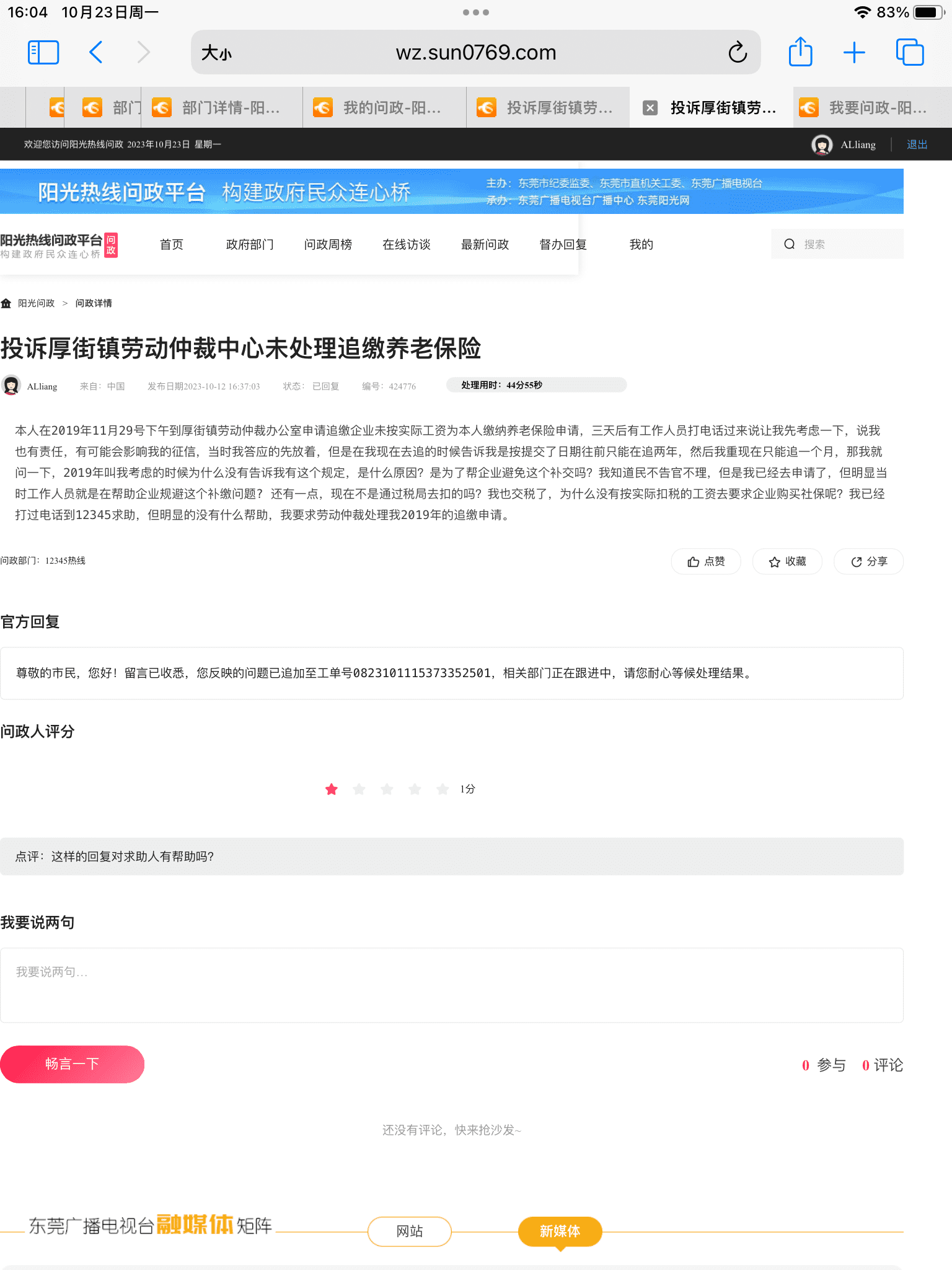 1、我的需求很清晰,就是我2019年11月29日提交的追缴企业养老保险在没有于本人确认取消的情况下,为什么不跟进追缴? 2、我在今年10月21号下午收到短信回复,但回复内容并没有正面回复我的问题 3、2019年11月29号,我是在厚街大道的劳动仲裁中心办公楼1楼大堂左手边的前台提交申请,如果不是仲裁中心,那是什么部门接受了我的追缴申请呢? 4、我投诉了那么多次,从来没有人回应过我所投诉的部门有误,我可以肯定当时接收申请的前台并没有牌子写明部门名称 总结:我不确定12345和这个平台的功能和目的是什么?作为普通市民,我个人以为这个平台是可以帮助市民解决困难的,但我反映了那么多次,我到今天还没有收到任何人的正面回复我所提出来的问题,虽然普通老百姓要争取自己的权益是非常困难的,但是为了维护自己的权益,我会继续尝试寻找不同的平台去反映我的问题和求助。