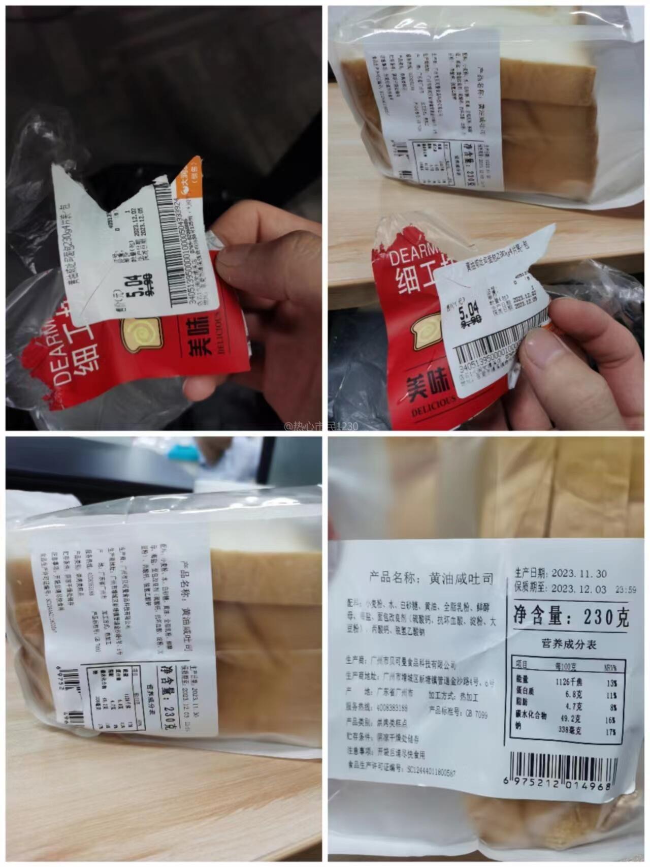 2023122晚上在大润发清溪店购买黄油咸吐司面包230g4片装包,产品条形码分别是6975212014968(标明生产日期2023.11.30,保质期2023.12.03)、34051395000010000504333924(标明生产日期2023.12.02,保质期2023.12.05),明目张胆修改生产日期及保质期再销售,周六吃完肚子不舒服,交易订单号2023120222001493451424514492。希望严惩黑心不良商家!!!(照片过大,上传不了,可额外提供清晰照片)