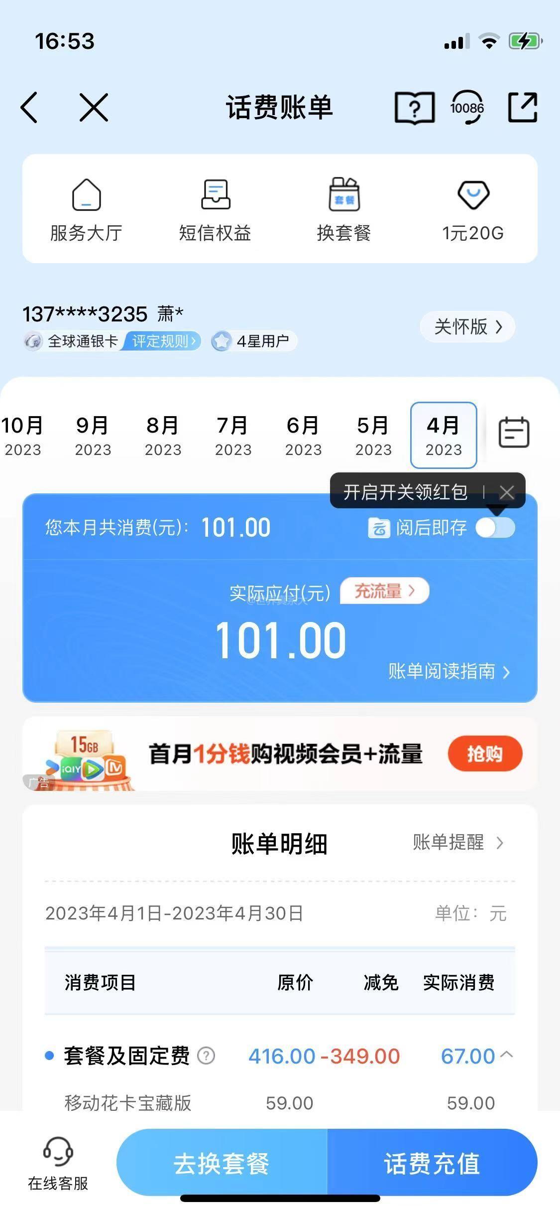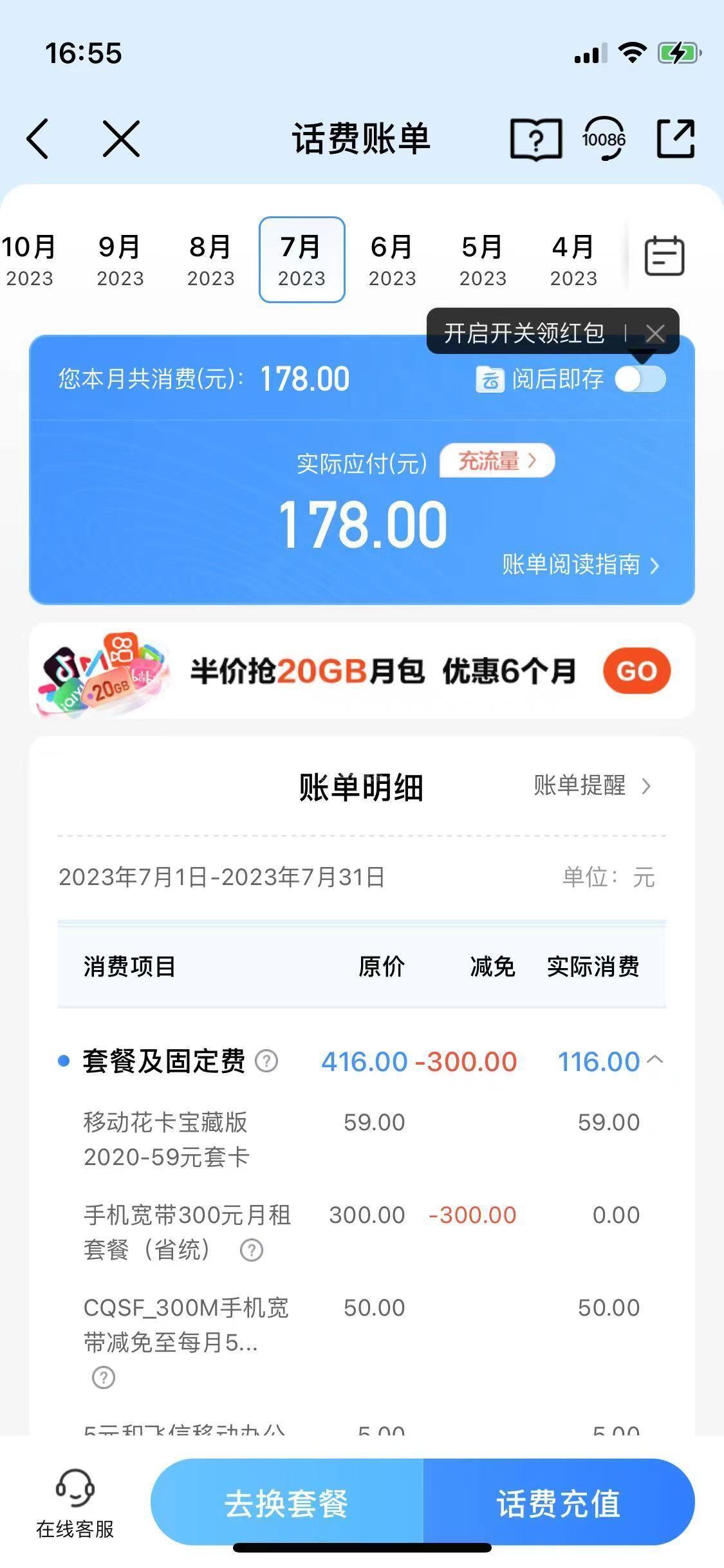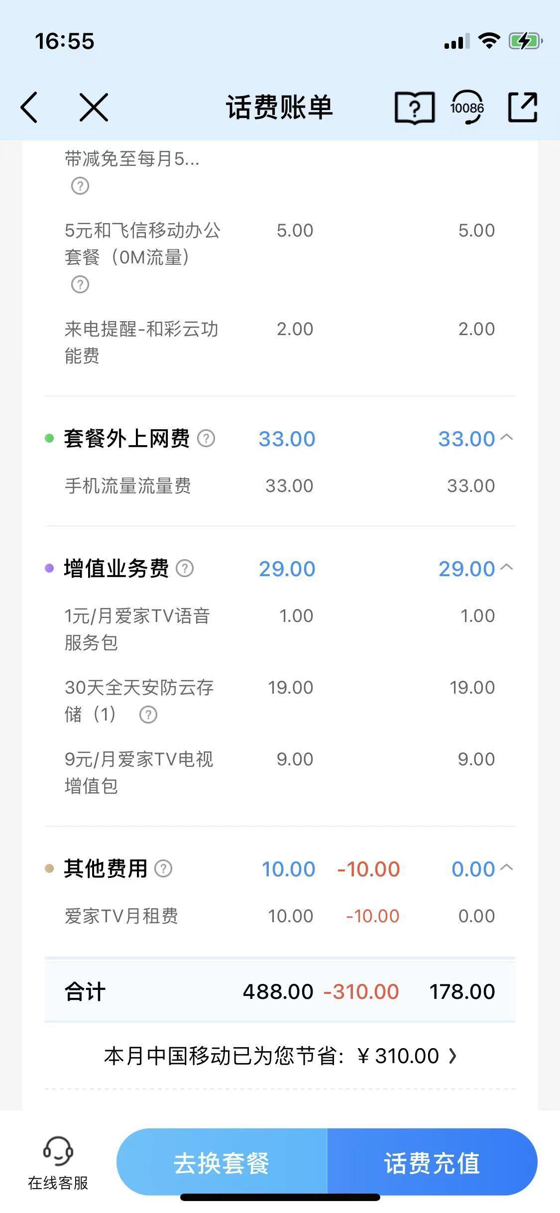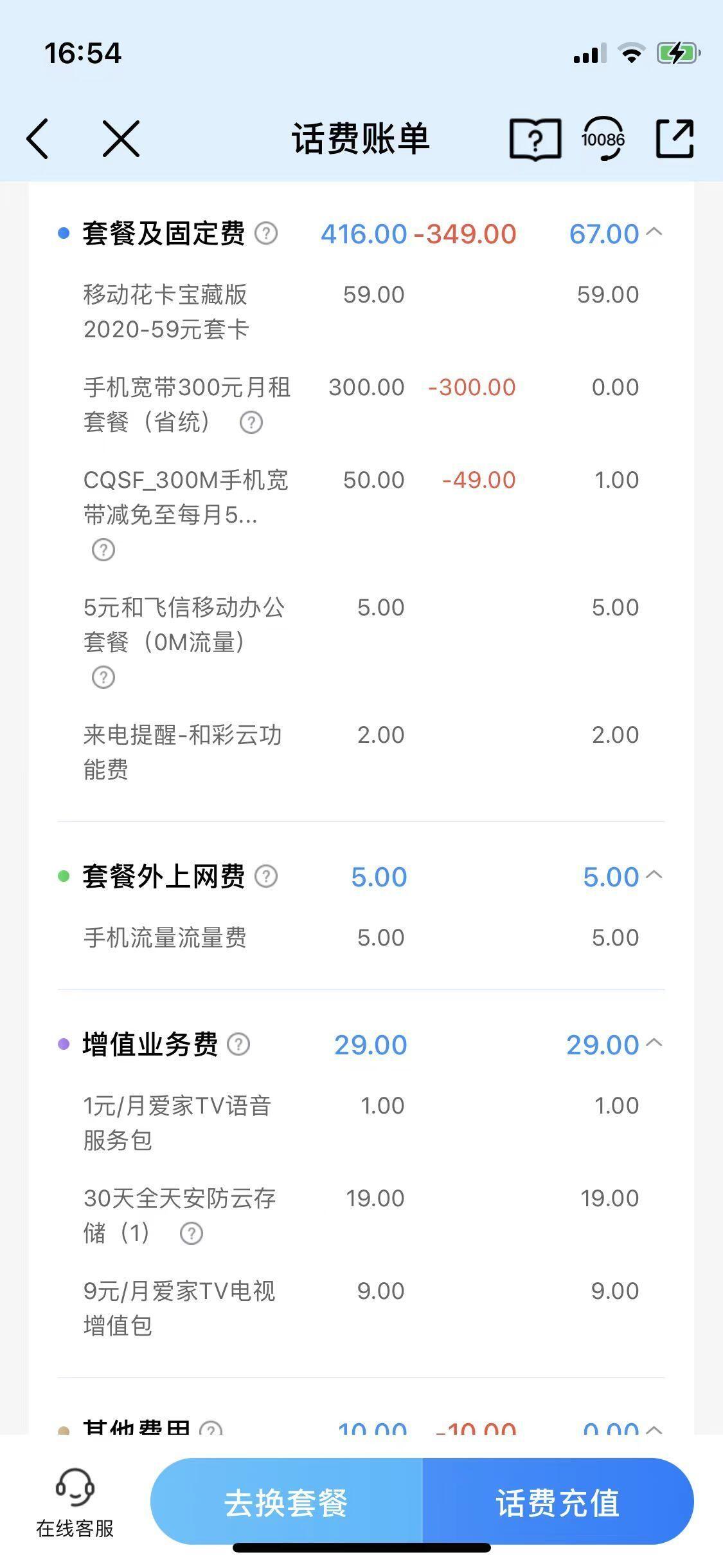 本人于2022年6月10日在东莞东城万达中国移动营业厅办理套餐(原手机月租139元),业务人员表示手机月租改为59元,支付宝上办理支付宝移动套餐扣费(24期,每月扣200元,共4800元),合约期为5年,5年内不得改套餐,(实质上是5年内手机月租套餐还是139元),就可享用增加宽带带宽,爱家监控,爱家TV机顶盒和礼品使用,并承诺期间不会产生其他费用。 由于本人手机是已经设置手机欠费自动充值100元,一直都没留意使用费用多少,至2024年4月11日发现,每月扣分还是139元,其中包括宽带、监控等费用,由于广东移动APP只能显示一年内账单,只能看到2023年4月,也存在监控与机顶盒扣分情况,已存在双重扣分现象,且已违约当初承诺5年内不存在其他扣费。 已致电中国移动10086了解情况,于次日中国移动客户经理(13922998165)给予回复表示可以赔偿4800话费到我电话上,本人对赔偿话费表示不满,需赔偿现金后,客服经理表示无法做到后挂机。随后10086客服与我联系,表示只能赔偿4000话费。 由于本人为现金消费,中国移动违约在先,导致经济损失,需有移动承担赔偿,且需现金赔偿;请阳光网介入处理,谢谢。