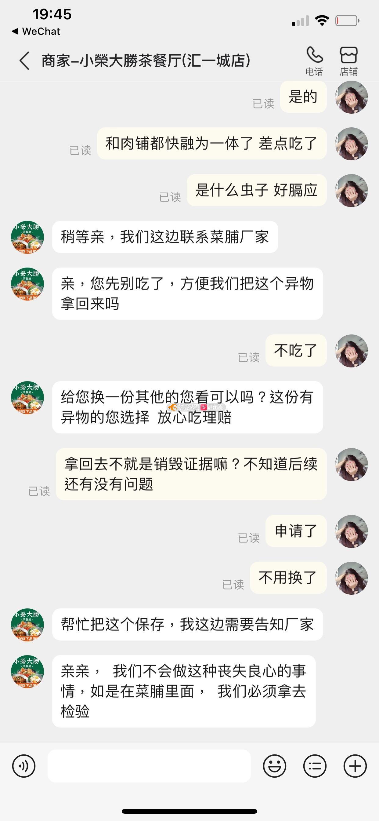 5月22号17:44分点了汇一城小荣大胜茶餐厅的外卖,吃出了不知名虫子,与商家沟通后,让我寄回去检验,但怕寄回去后不了了知,决定还是请有关部门介入调查,希望能提供真实的检验报告和合理的赔偿。