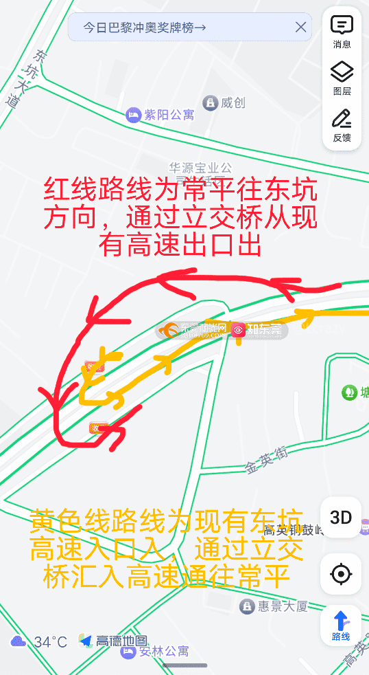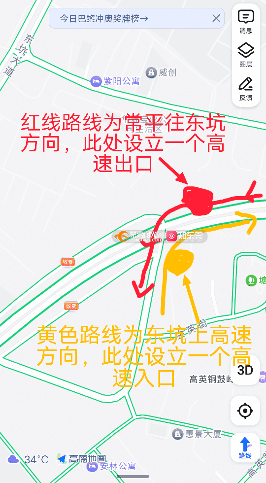 广龙高速东坑出入口如同虚设,只允许广州方向车辆出入,对于松山湖、东坑的车主往惠州方向一点都不友好!其实不是没办法解决,只是有没有用心去办,在此特提出附图说明的两种解决方案,盼能采纳!