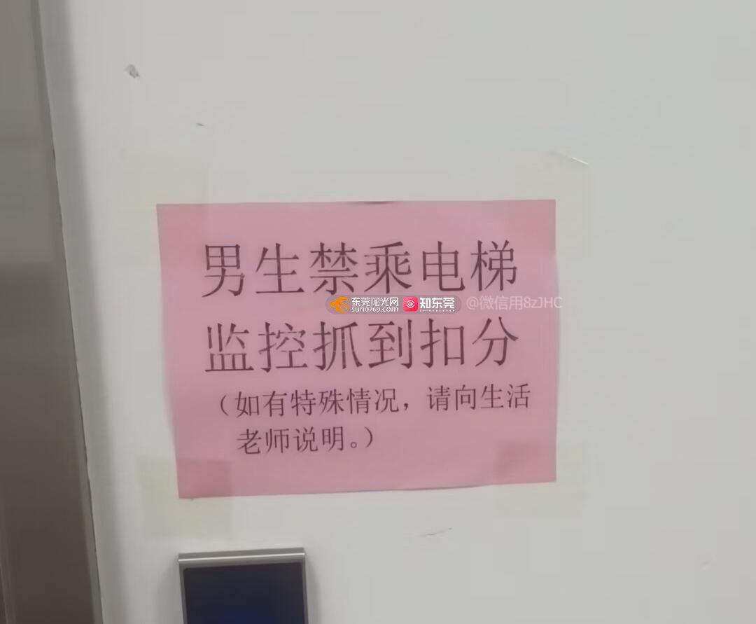 据了解新风路的东莞中学(初中部)的宿舍楼是装有5台电梯的,但规定了男生不可以使用电梯。如果男生低楼层,女生高楼层,这样区别对待也是可以理解的,但现在是很多男生的楼层都在九楼十楼的,却不可以坐电梯??建议学校分出每个电梯设置一下固定停的楼层,这样就不会因为人多的情况下,电梯等待时间过长。虽然男生是需要锻炼也不至于每天爬几次高楼吧!男生也是肉做的,也会累的。同时也建议学校服务部下架所有饮料,换成纯净水和苏打水等健康的水饮和零食。