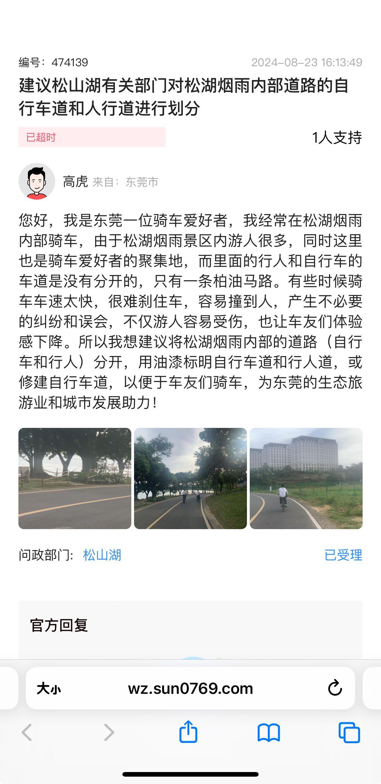 尊敬的市民,您好,您反映的问题已收悉,现就相关情况回复如下:收到您的反馈后,我们十分重视。经核查,您于2024年8月23日通过阳光网反映公园人车分流问题。热线已按“市镇联办、属地为主”原则将工单转派至松山湖办理跟进。期间,部门因事项办理需求,于2024年8月26日提出延期申请。根据《东莞市政务服务便民热线管理办法》第十七条 (六)因事项办理难度大、诉求人补充新材料、发生自然灾害等情况无法按期办结的,承办单位应当在办理期限内向热线提出延期申请。延期时限不得超过有关法律、法规、规章规定的最长时限,延期次数不得超过2次。首次延期承办单位应当说明理由,延期时限与相同类型事项的办理期限一致。第二次延期承办单位应当附上佐证材料,内容包括延期理由、延期依据、办结时限并加盖公章。另外核查到,您反映的问题,松山湖于2024年9月3日答复办理结果。下来,热线中心会继续提升工单处理质量,优化工作流程。感谢您对热线的监督和支持!