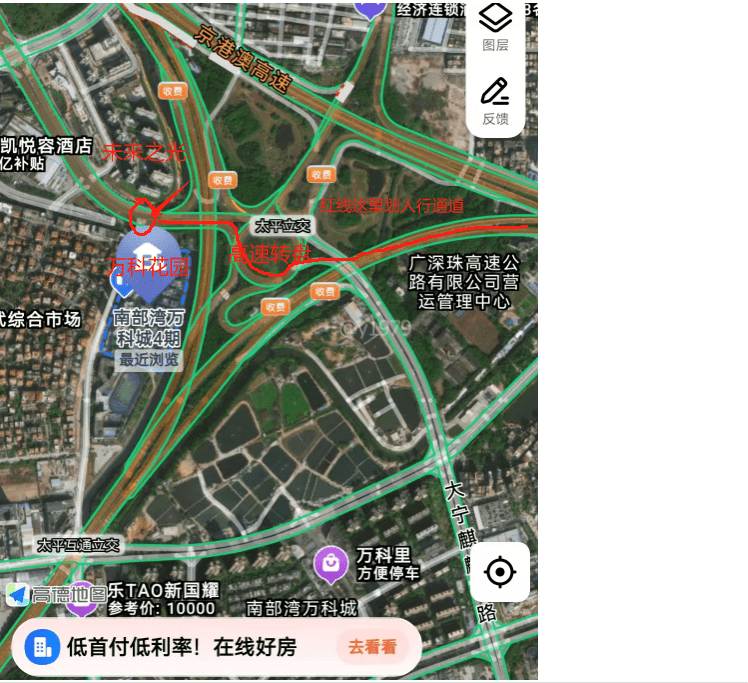 尊敬的各位领导,您们好! 我是万科花园住户,自2018年入住以来,亲眼见证了虎门经济的发展与交通道路的畅通。不仅将我们小区门前的荒坡修成了宽阔的城市道路,还将河流旁边的杂草建成了可以运动、跑步、骑行的绿道,相信各位领导为此做了大量工作、费了大量心血,作为业主、住户,在此表达深深的谢意! 因为我国经济不再像以前一样维持高速的发展势头,而是向上向优,持续向好的态势发展,所以需要强大流动性的支持。但在网络持续很多年后的今天,价高质劣的商品充斥各个方面,人们渐渐地还是希望能回归实体经济,能亲自到实体店购物。 由于我们小区和对面未来之光小区的住户人数日渐增多,早上送小孩上学的、家里老人买菜的,外卖小哥送快递的,基本是靠步行或电动车出行,而旁边又是一个高速转盘,只有机动车道,没有人行通道,行人无法通行,因此基本的生活需要都大大减少了互通性,减少了各种消费的可能性,又怎么能谈发展呢。必须要出行时,只能违规危险地通行在机动车道上,因此发生过很多次事故。就在今天早上又有一个外卖小哥与机动车发生事故。见图。 希望领导能实地考察一下具体情况,适当增加或划出一部分区域作为人行通道,或者在附近安装红绿灯、划出人行横道、架设人行天桥、修建地下人行通道等等,在尽量保证我们居民出行安全的前提下,也让我们能为虎门经济做出一份拉动消费的贡献,谢谢! 详细地址:东莞市虎门镇捷东路2号万科花园(也叫南部湾万科城四期),在百达路旁边。 万科花园与对面小区未来之光中间隔着百达大道,再往右边是大宁社区方向,我们小区居民的主要生活往来,与大宁小区方向,南部湾万科里方向比较频繁。希望是往这个方向可以开通人行通行,以保证居民出行的便利。