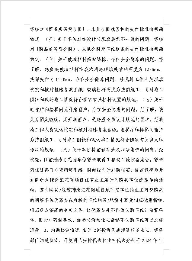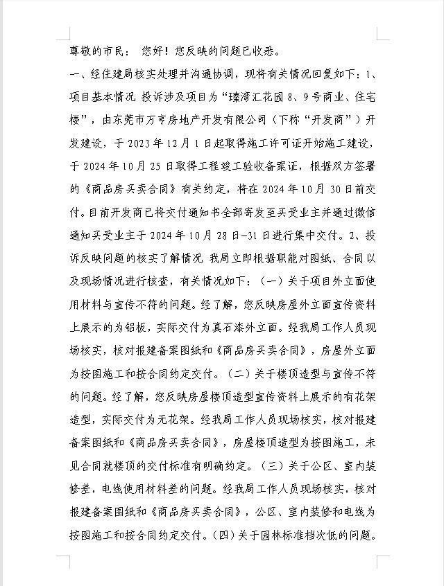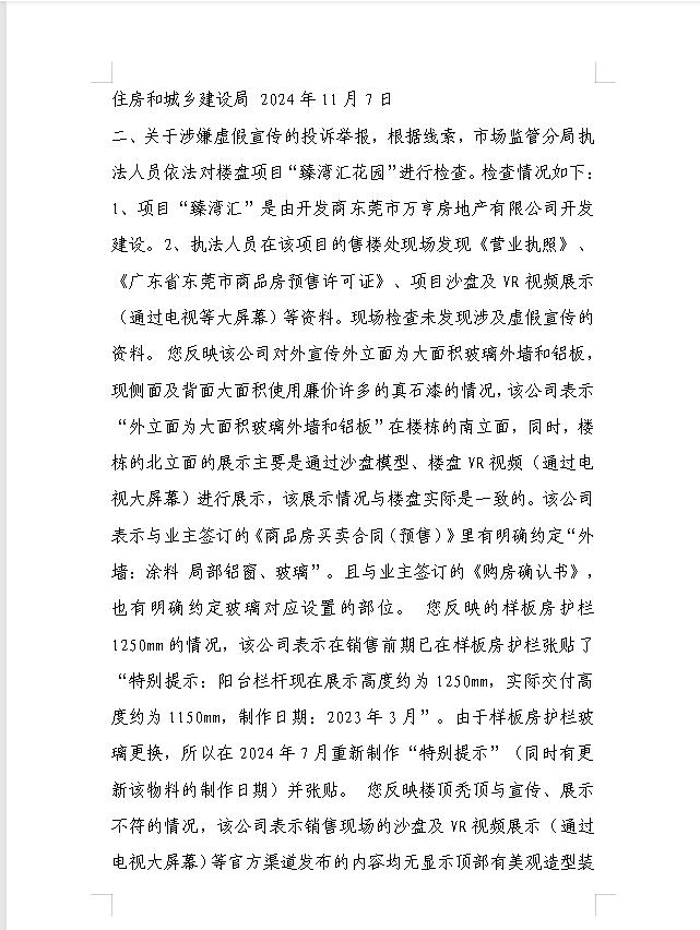 当初怀着对楼盘美好宣传的期待,对更高生活品质的憧憬,倾尽积蓄购买了该楼盘的房屋,当前近收楼面临着诸多严重的问题: 1、外立面材料:开发商在前期各类宣传中,无论是文字、图片、视频中,均宣称和展示楼盘外立面为“大面积玻璃外墙和铝板”,而如今5 、6、7、8、9栋侧面及背面却大面积使用廉价许多的“真石漆”,这一点很大程度上误导了我们的购房意愿是欺诈。要求将每栋真石漆外立面更改为铝扣板外立面。 2、小区园林高价低配:该楼盘从开盘至今,单价都是属于东莞最贵楼盘之一,但是楼盘目前所呈现的园林和配套,其用品,属于严重货不对板,要求出整改方案,园林和公区标准不应低于同在市区、同期建设、同是万科瑧系,且售价比瑧湾汇低的瑧山汇。同时,立即组织业主开放日,提供小区园林详细施工、效果图,并与业主沟通达成一致。 3、装修滥竽充数,降低材料规格质量,和样板房交付标准区别很大,要求开放装修过程业主代表随时现场监督。 4、玻璃护栏减标降配,是安全隐患,高层超高层护栏玻璃样板房1250mm,2024年7月万科在样板房的样台护栏加贴标识实际交标为1100mm.业主是在2023年摇号买的房。为什么时隔1年4个月后才加贴标识?为什么侵犯业主权益?随意降标降配??万科属于超高楼层建筑,存在安全隐患,为避免安全事件发生,请督促万科整改。 5、楼顶秃顶(与宣传、展示的不符)前期宣传照中,楼房顶部有美观造型装饰,万科为了节约成本,当前是光秃秃的平顶,与展示的宣传图不符,请协助约束万科整改。 6. 2023年万科预存车位款,当时跟业主宣称车位不共线。可现在的车位却是共线的。请问,万科提前一年通知业主预存车位款,是否是非法集资?合法吗? 7. 瑧湾汇6万+的房子,楼梯是刷漆的。 友商3万+的房子,楼梯是贴瓷砖。 瑧湾汇6万+的房子电梯厅是凉霸。 友商4万+的房子,电梯厅新风统。 瑧湾汇6万+的房子石漆外立面。 友商5万+的房子是铝扣板。 这与当时万科宣传的“城市的名片,城市的封面”格格不入,夸大虚假宣传!!!既有损城市中心市容市貌,又置高价购买的业主群体利益于不顾。我们严重抗议万科偷工减料,虚假宣传,销售欺诈的行为,我们强烈渴求政府介入,进行专项调查,给业主们一个公平正义的解决方案!