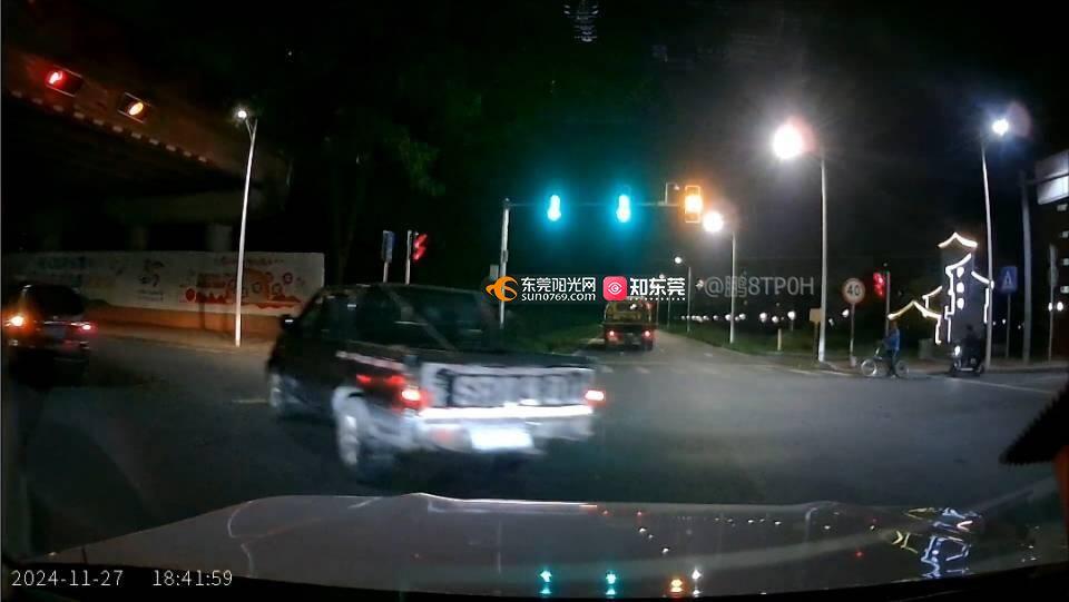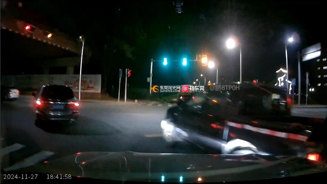 2024年11月27日18时41分本人驾驶车辆经环城北路石碣沙腰段辅道驶出,在沙腰村路口自东向西方向过红绿灯,右侧直线行驶车辆不按交通指示方向违章左转,别车,差点造成交通意外,希望交警部门对该车辆及驾驶员进行依法处罚。谢谢。