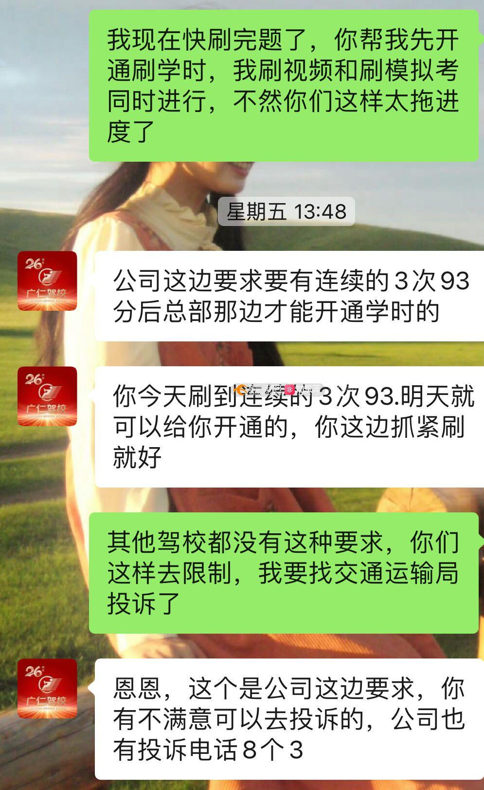 1月11日我在广仁驾校报名,报名后才得知广仁要求考生将题库1800多道题刷完,并且三次模拟考试分数达到93分,才能开通学员刷科一视频学时的权限,这严重拖慢了驾考进度。我认为刷视频学时与练习科目一题目并不冲突,然而广仁驾校私自强加条件,为了自己的合格率,要求学员必须完成刷完题库和模拟考试达标两个条件,才能开始刷视频学时。本来就是学生,时间少,平时寒暑假才可以回东莞练习,被广仁这个条件限制之下,必须刷完题才能刷视频学时,非常浪费时间,朋友报名的其他驾校并没有类似的要求,完全是广仁自己的限制要求。请交通运输局督导广仁驾校,取消限制性条件,让学员能够同时练习题目和刷视频学时。
