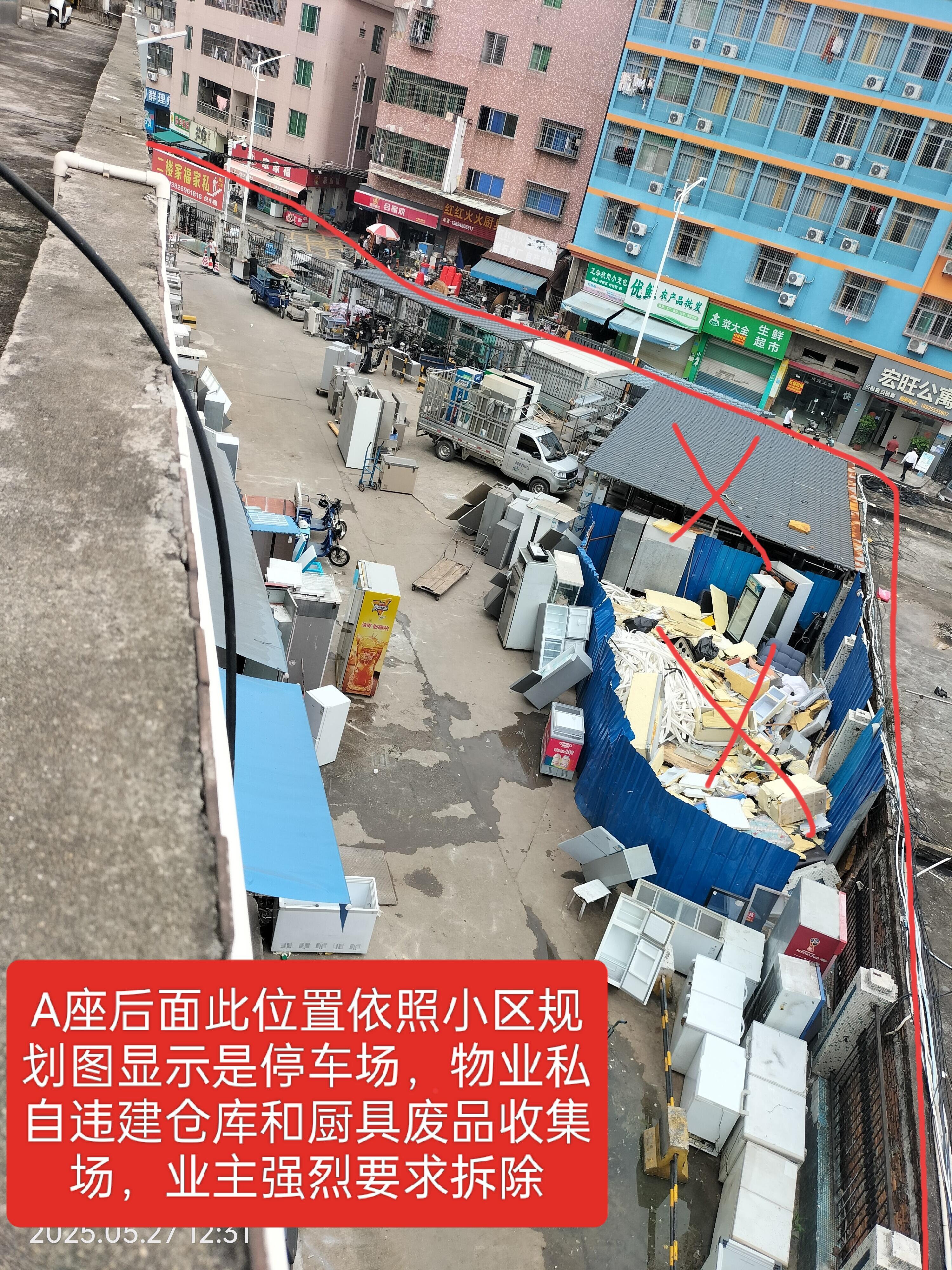 宏明小区A座后面停车场,物业将停车场私建仓库和垃圾收集场为商铺存放厨具泡沫易燃等废品,业主长期以来积极和物业沟通屡次无视业主诉求。 附上小区A座规划图作佐证,强烈要求物业方将违建的仓库和垃圾收集场拆除,严格按规划图恢复为停车场,请相关部门按法律法规办实事,感谢!