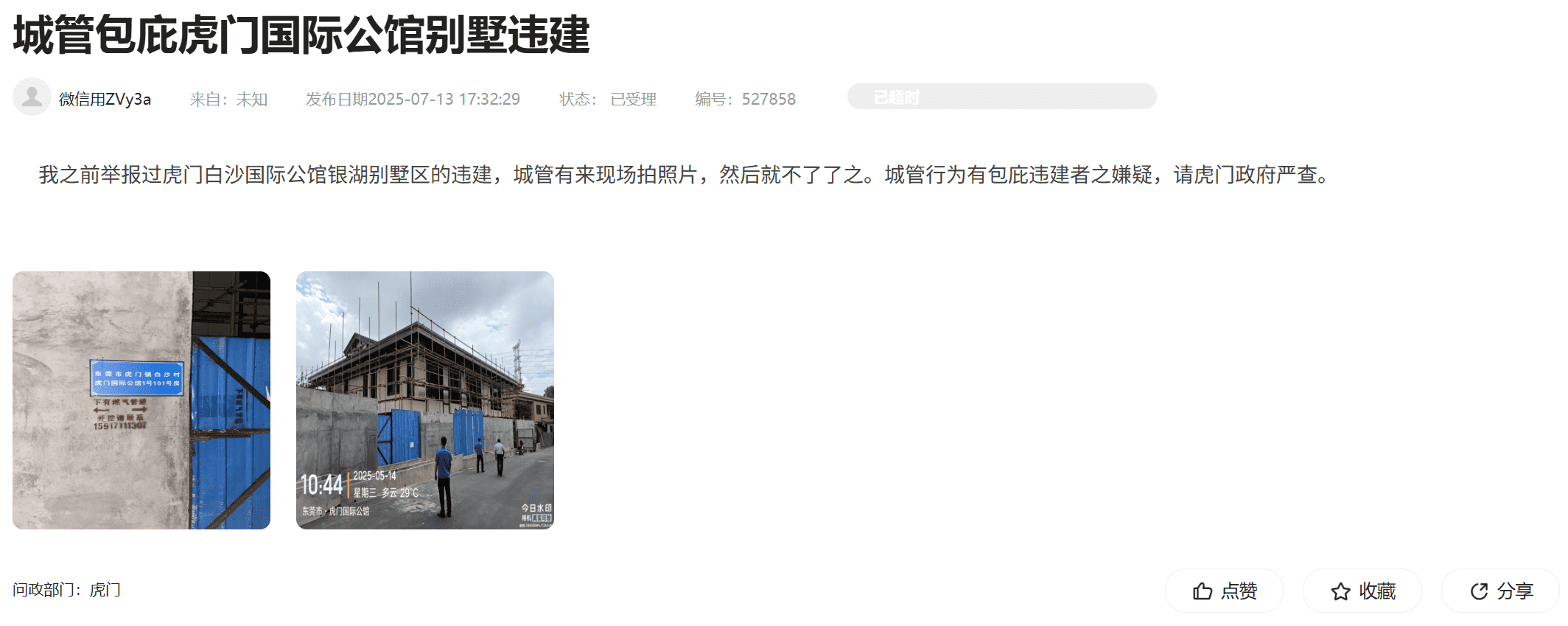 附件图片是我之前提出的问政。 受理后,虎门镇没有回答,涉嫌地方政府不作为,包庇违建。