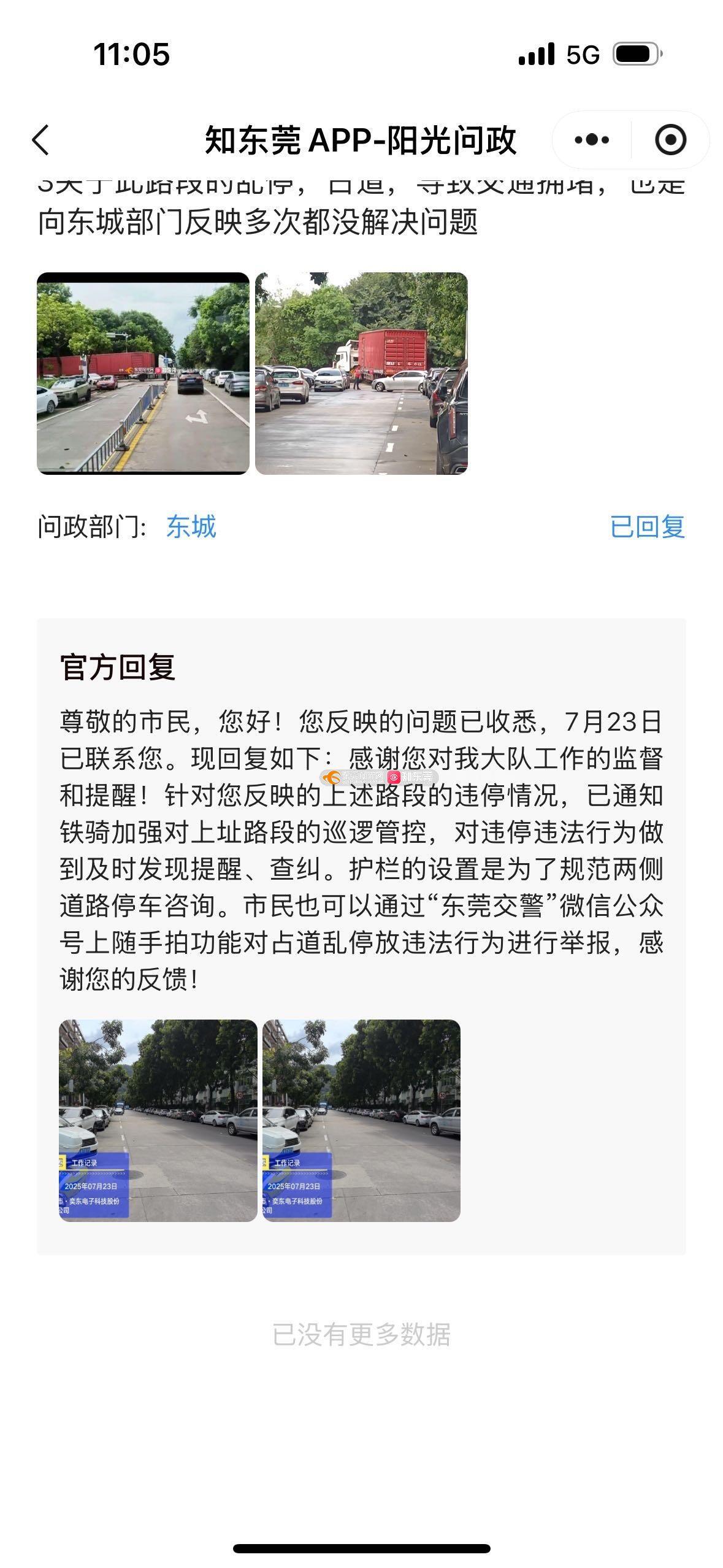 1:根据投诉东城科技园同欢路奕东电子门口段乱停,导致该路段经常堵车,反映多次无效果,7月22日再次反映情况,7月23日东城交警大队至电本人会安排人去处理,7月24日问政平台回复了现场处理结果(以下附图片),本人对处置情况质疑,本人一天经过此路段N次,乱停问题没有改变,包括工作人员现场查看那天,乱停的车辆上一张温馨提示纸也没有,就拍张照片回复一下,重点是反映奕东电子门口路段车辆,而执勤人员现场拍摄的照片是同欢路前一段停车秩序良好路段来拍照片,而就在执勤人员拍照位置转个身后段乱停乱放的路段不拍出来(见下图)这是敷衍市民,民警的办事目的是为了什么 2:投诉执勤人员以不真实的现场执勤照片回复市民,给个解释 3投诉东城交警队多次反映问题不处理,不为民办事 4对529239件的回复结果评价为不满意