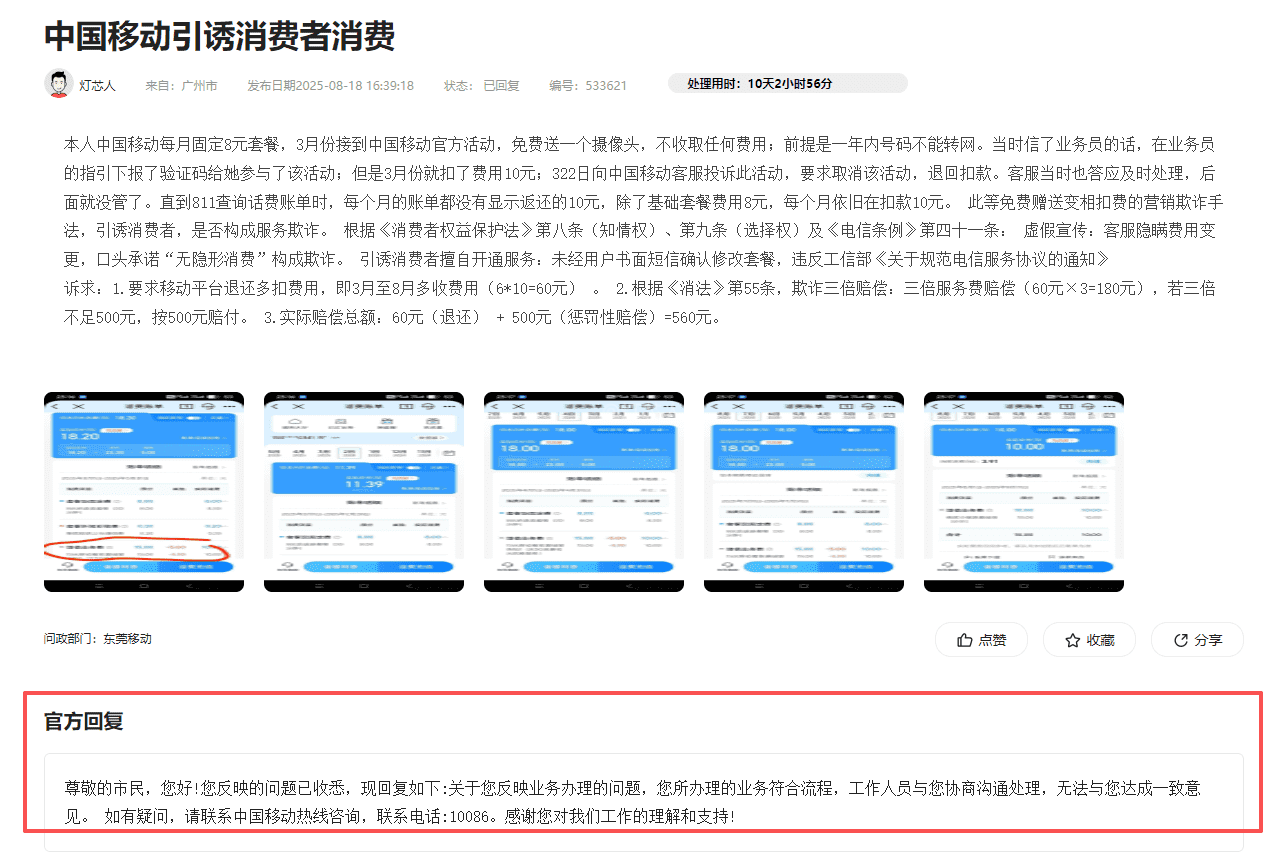 本人中国移动每月固定8元套餐,3月份接到中国移动官方活动,免费送一个摄像头,不收取任何费用;前提是一年内号码不能转网。当时信了业务员的话,在业务员的指引下报了验证码给她参与了该活动;但是3月份就扣了费用10元;322日向中国移动客服投诉此活动,要求取消该活动,退回扣款。客服当时也答应及时处理,后面就没管了。直到811查询话费账单时,每个月的账单都没有显示返还的10元,除了基础套餐费用8元,每个月依旧在扣款10元。 此等免费赠送变相扣费的营销欺诈手法,引诱消费者,是否构成服务欺诈。 根据《消费者权益保护法》第八条(知情权)、第九条(选择权)及《电信条例》第四十一条: 虚假宣传:客服隐瞒费用变更,口头承诺“无隐形消费”构成欺诈。 引诱消费者擅自开通服务:未经用户书面短信确认修改套餐,违反工信部《关于规范电信服务协议的通知》 诉求:1.要求移动平台退还多扣费用,即3月至8月多收费用(6*10=60元) 。 2.根据《消法》第55条,欺诈三倍赔偿:三倍服务费赔偿(60元×3=180元),若三倍不足500元,按500元赔付。 3.实际赔偿总额:60元(退还) + 500元(惩罚性赔偿)=560元。 维权以来,目前业务已经取消,但是诉求没有达到。中国移动违法犯罪成本太低,毫无底线坑害消费者,向中国移动官方反馈,自身违法事实丝毫不提,还回复流程合理?视消法等法律条款成白纸。请求上级部门介入处理,诉求维持不变。