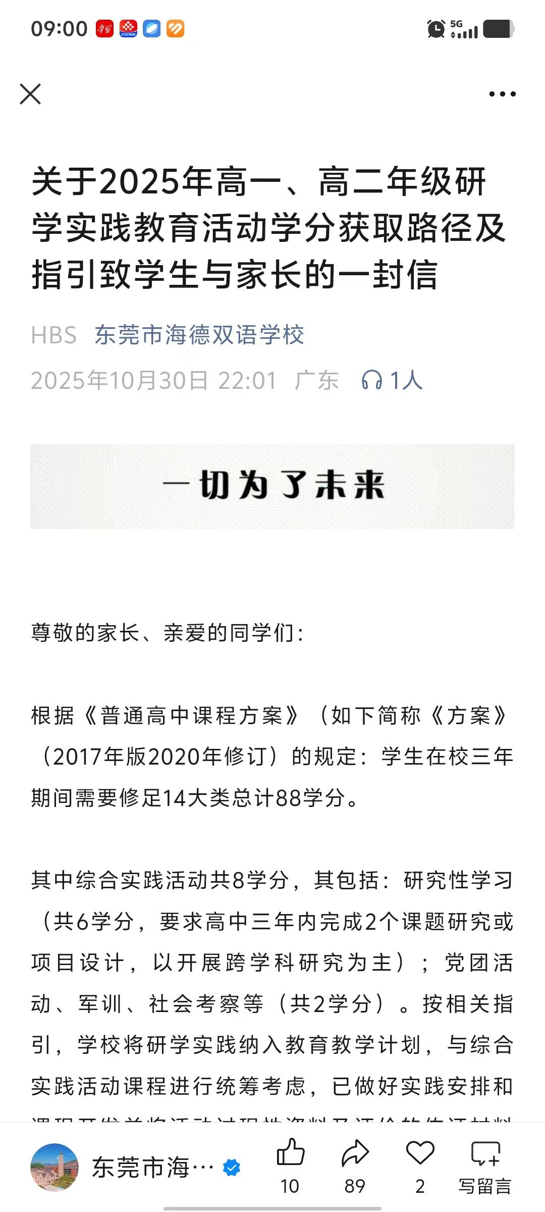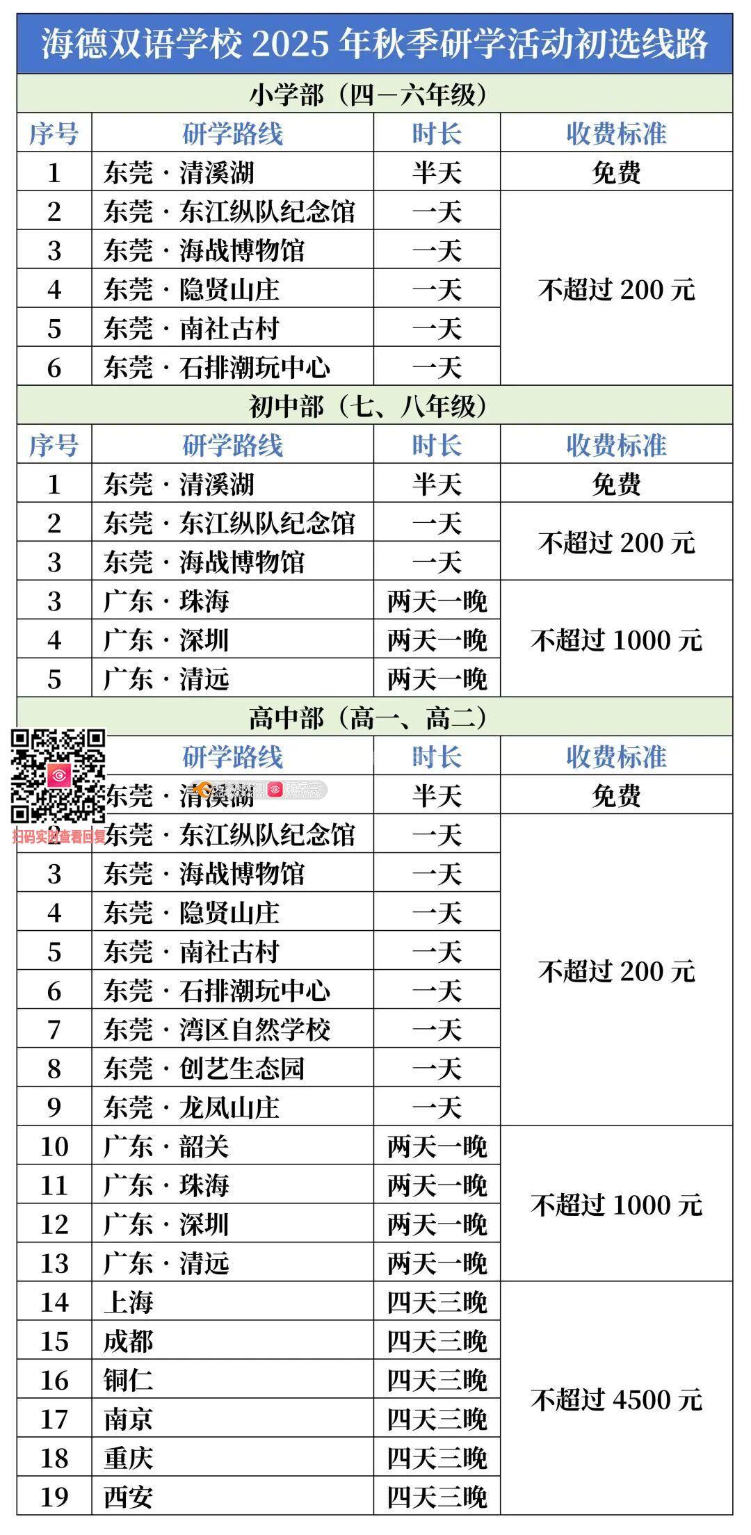 1. 核心问题:变相强制与“自愿”的名存实亡 · 替代方案极为苛刻:文件规定,不参加研学需完成40小时志愿服务或一个研究性学习课题。对于一个学业繁重的高中生而言,40小时志愿服务相当于全职工作一周的时间,而独立完成一个高质量的课题也需耗费巨大精力。这实质上是用一个“不可能完成的任务”作为惩罚,逼迫学生和家长“自愿”选择参加研学。 · 涉嫌违反自愿原则:教育部明确规定研学旅行应坚持“自愿原则”。学校通过设置极不对等的替代条件,使得“自愿”形同虚设,构成了 “变相强制” 。这是整个事件中最核心的违规嫌疑。 2. 收费问题:高价线路为主,公益性不足 · 收费结构失衡:从《初选线路》表可以看出,高中部提供了大量高收费的跨省市线路(3500-4500元),而低收费(200元内)或免费的本地线路仅有寥寥数条。这种课程资源分配方式,有引导甚至逼迫学生选择高消费项目的倾向。 · 涉嫌捆绑收费:将学生毕业所必需的“学分”与这些高额收费的旅行项目进行深度捆绑,涉嫌违反教育部关于“不得擅自设立服务性收费和代收费项目”和“严禁强制或变相强制”的规定。 3. 活动性质问题:“研学”还是“旅游”? · 文件中提到的上海、成都、西安等跨省长线项目,时长仅为“两天三晚”,其中大量时间会耗费在交通上。如此仓促的行程,能否有效开展深入的“研究性学习”令人怀疑,其性质更接近于“观光旅游”。 · 如果活动内容与“研究性学习”的名目严重不符,那么将其作为必修学分项目并收取高额费用的合理性就荡然无存。且补学分的形式是否合法合规需要一个解释,为什么人家花钱去研学一天24小时就可以获得一学分,而不参加学校研学却要参加40小时志愿活动才可以获得一学分?若果按教育效果和教育意义志愿活动不比研学(旅游)强太多了?