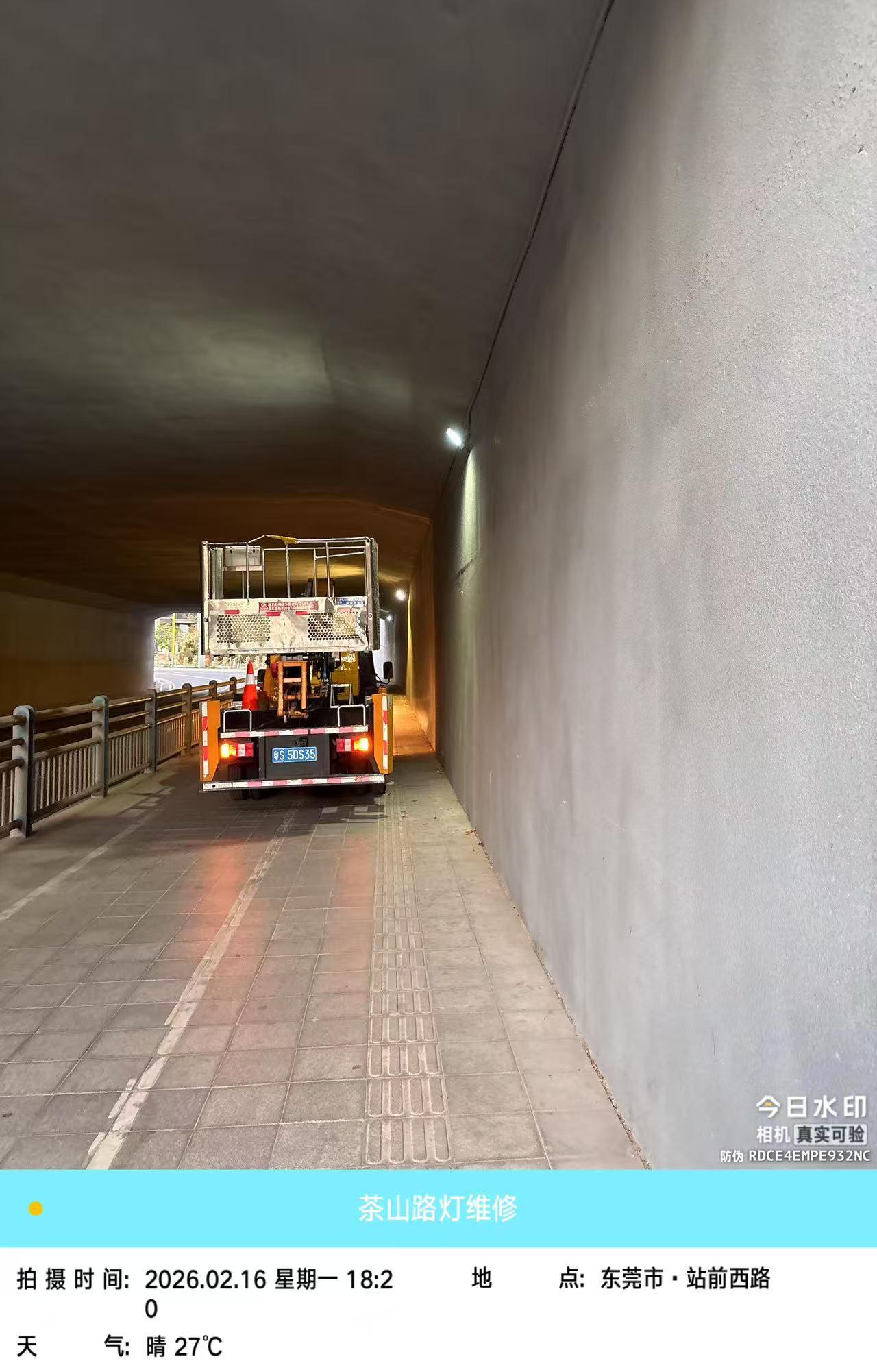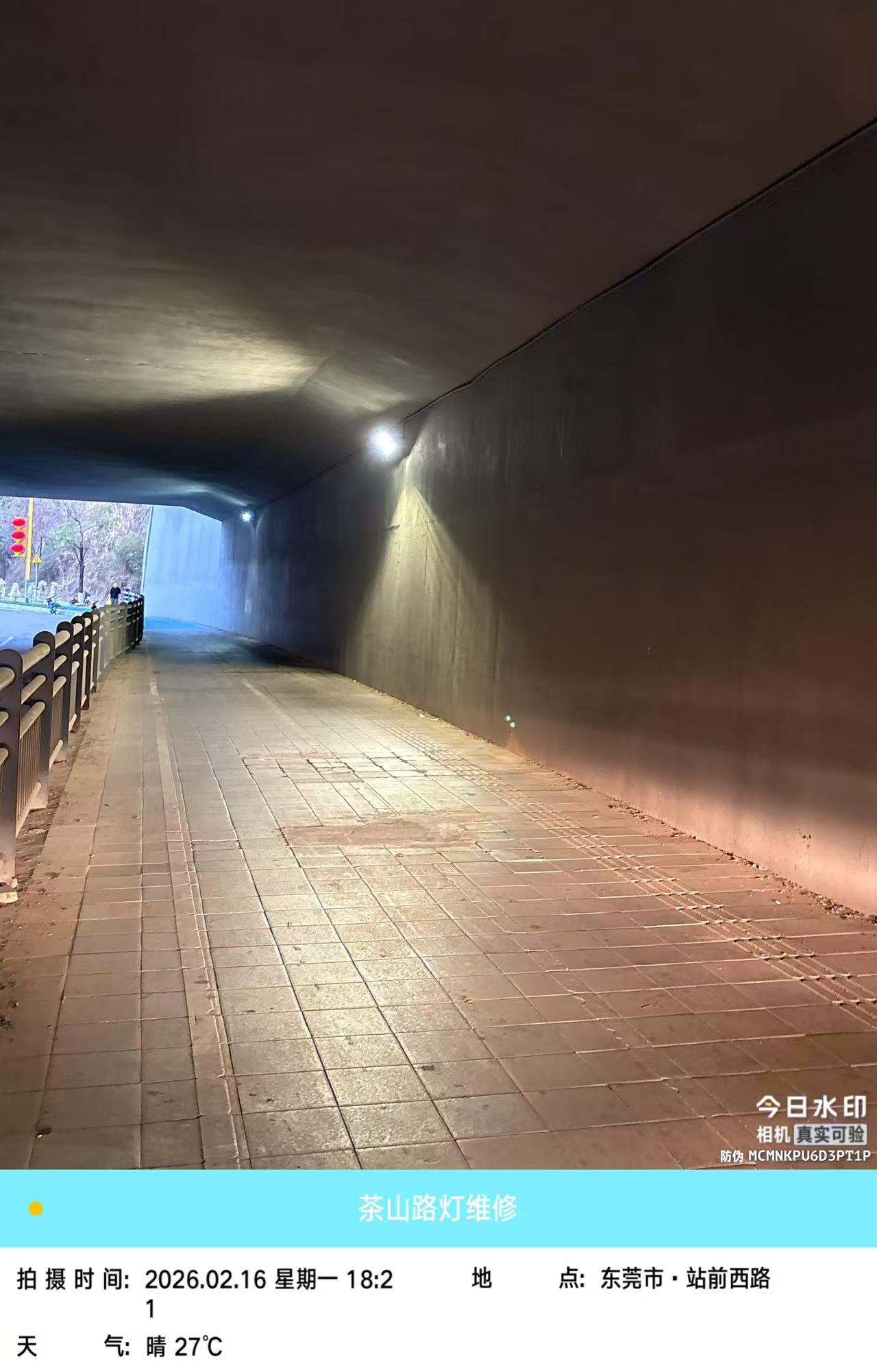 有一侧夜间又没有开灯,该路段人流比较密集,周围有火车站和居民小区,属于茶山镇范围,晚上隧道不开灯,对骑车和步行的人都不方便,容易有安全隐患,请尽快把灯打开
