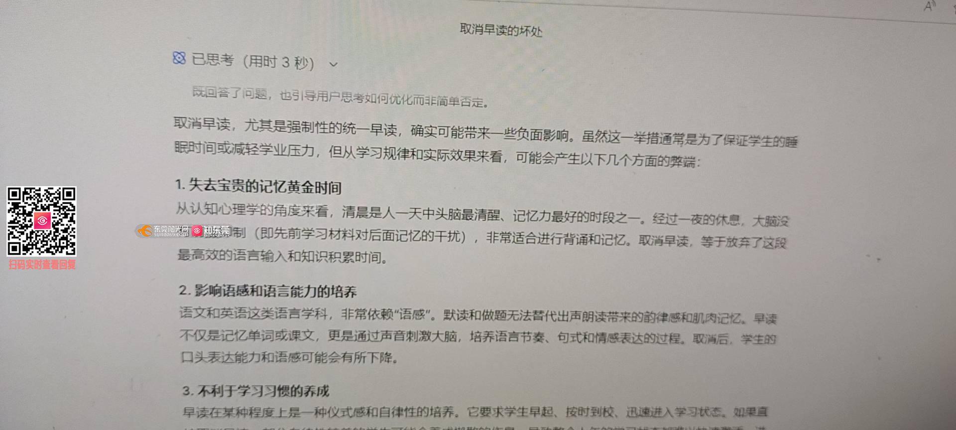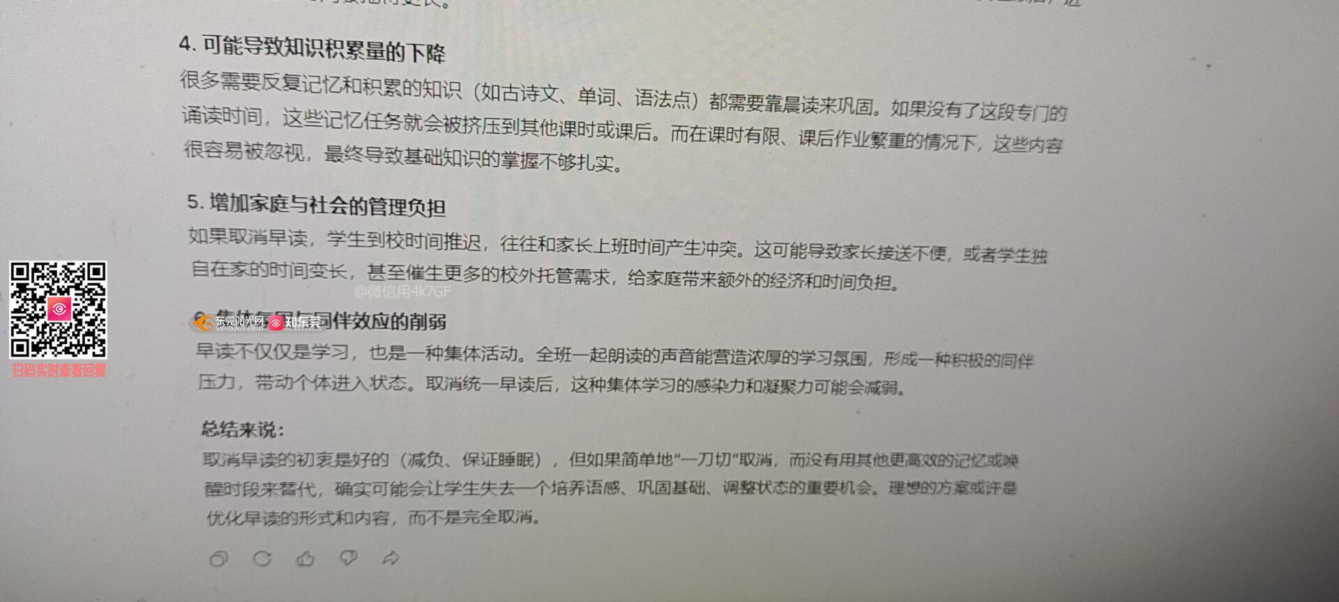 取消小学生早读劣势: 少了固定朗读时间,语感、记忆、识字积累变慢,不利于养成早起学习习惯,学习效率受影响,取消早读并没有让孩子多睡,上学时间跟以前一样。