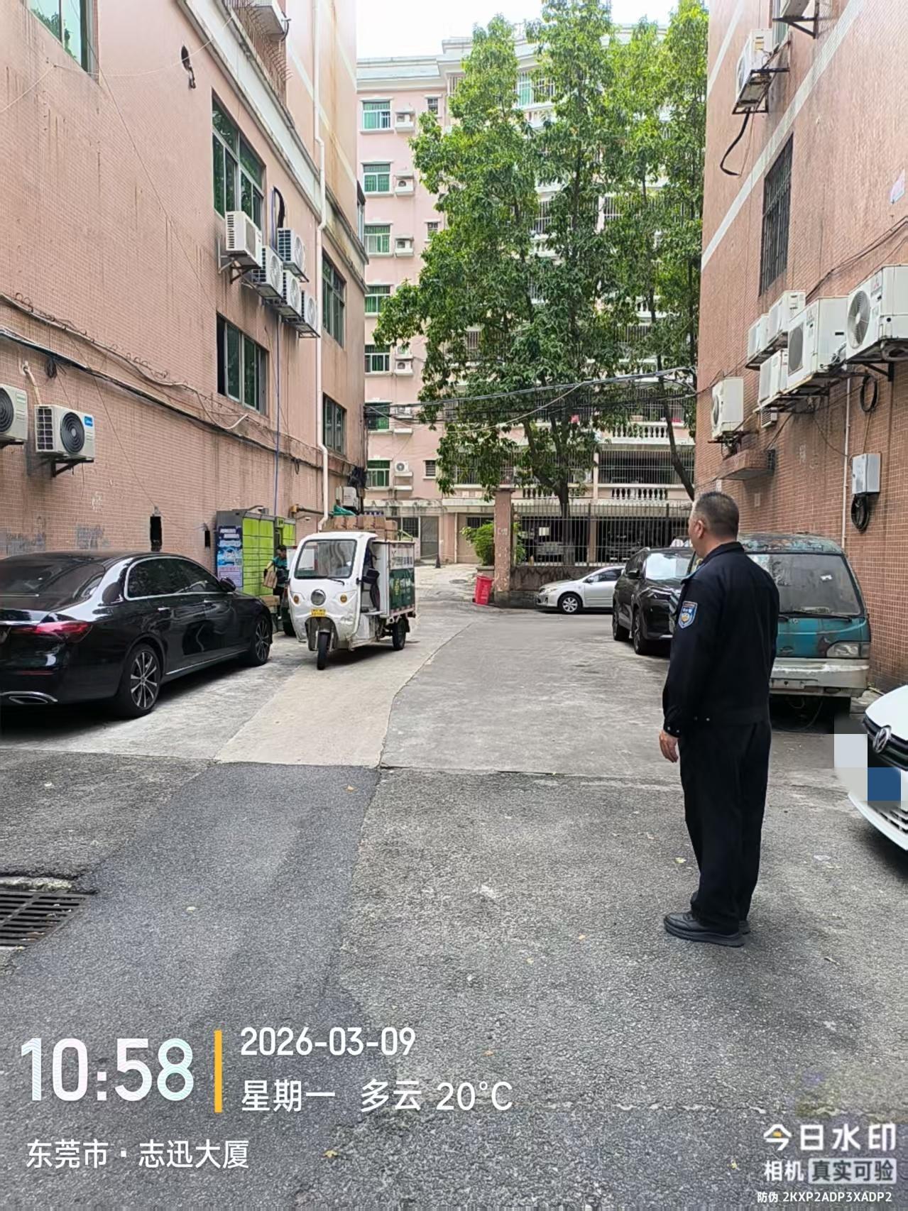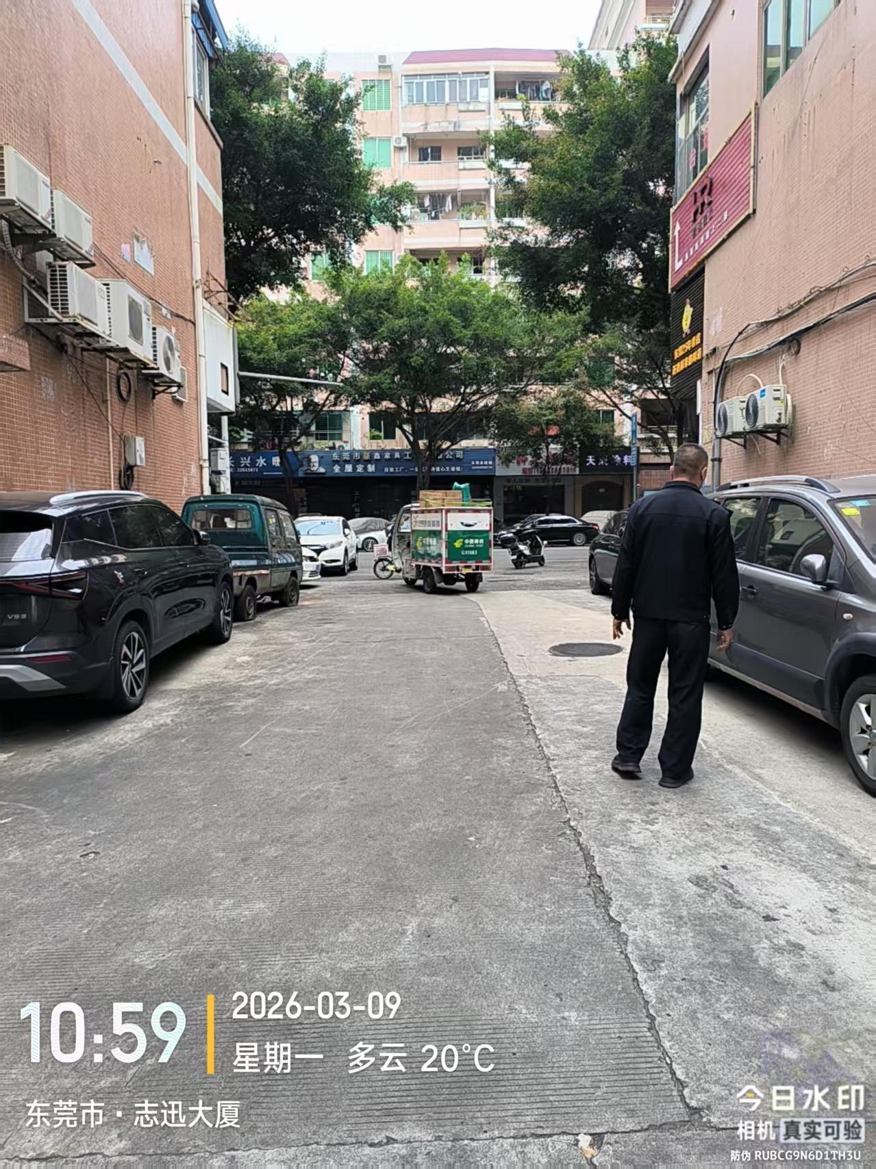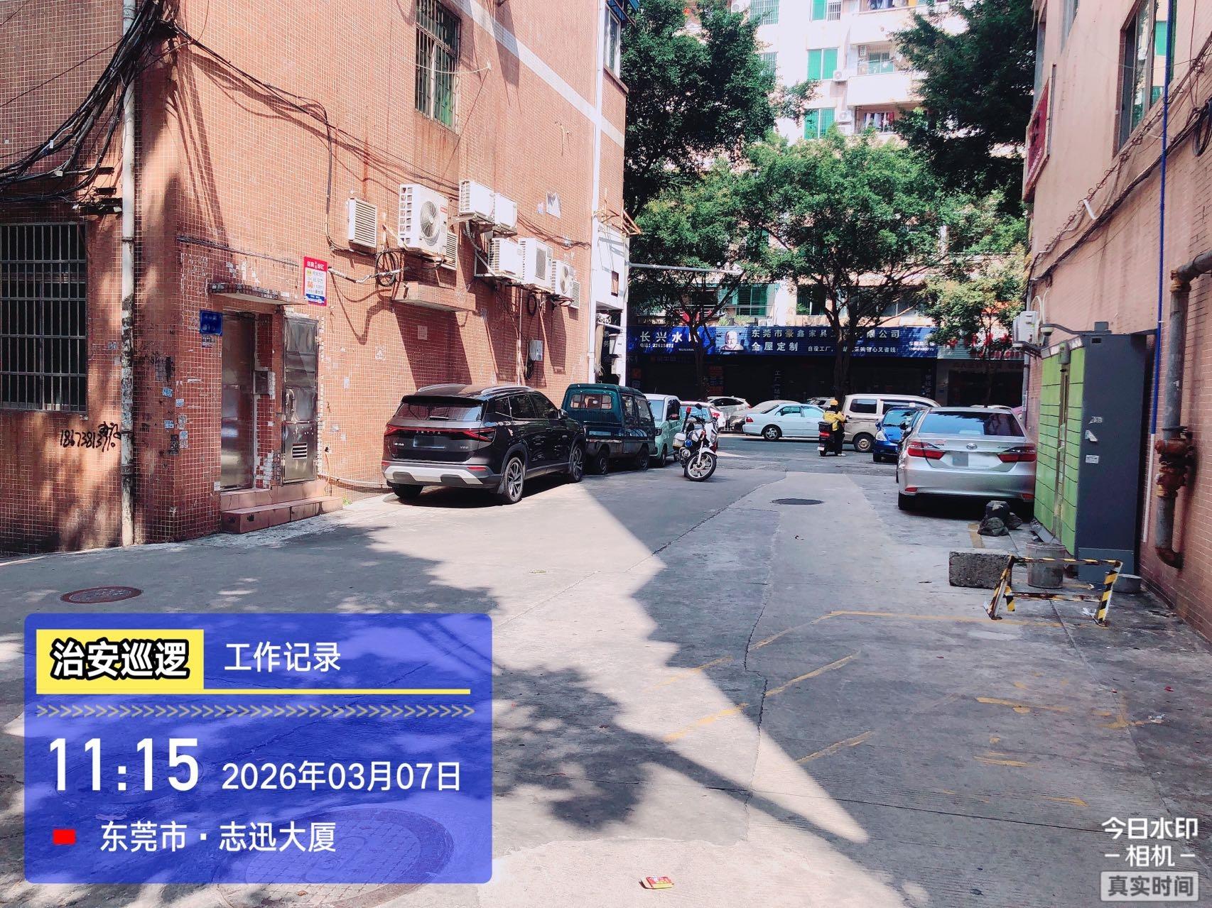在东莞东城堑头社区志讯大厦出入口车辆乱停乱放,堵塞消防通道。