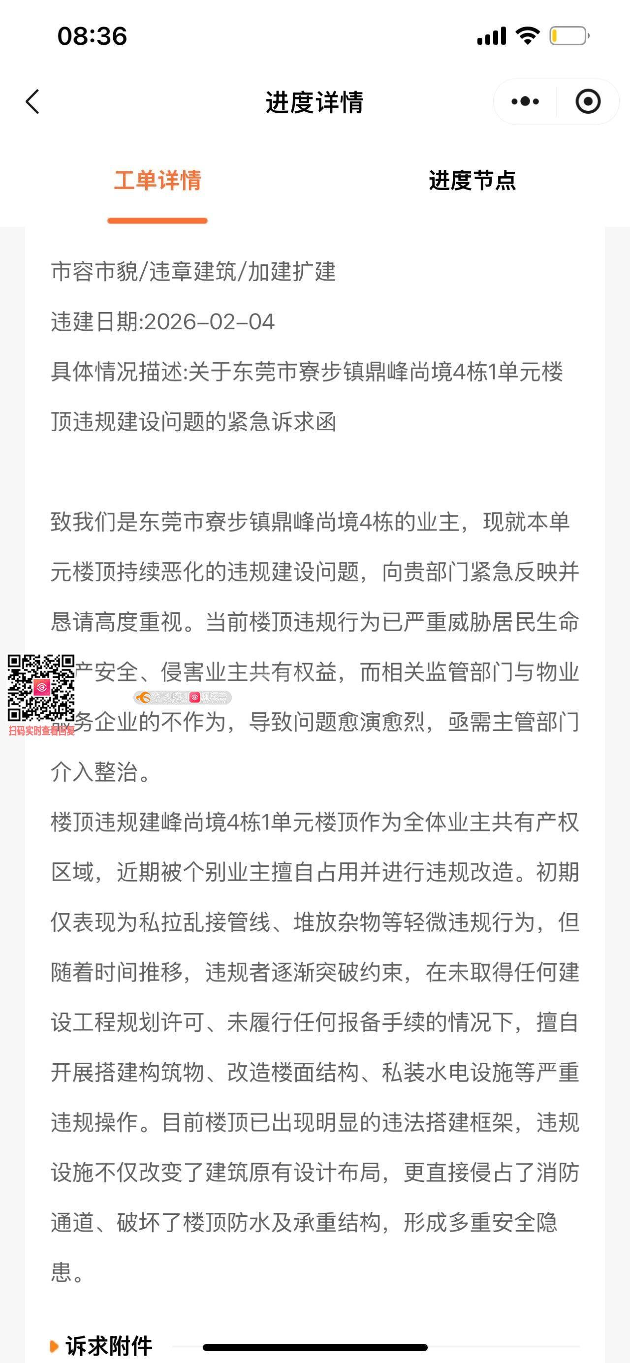 尊敬的寮步镇政府、城管执法局及相关主管领导: 我们是东莞市寮步镇鼎峰尚境4栋业主,现就本单元楼顶违建问题,再次紧急投诉: 该楼顶属全体业主共有,个别业主擅自搭建构筑物、破坏承重与防水、侵占消防通道,已构成严重违法,形成重大安全隐患。此前寮步镇违建办已明确承诺:春节后安排拆迁队进场拆除违建。但截至2026年4月4日,整整两个月过去,违建未动分毫,承诺完全未落实,明显存在基层履职不力、监管缺位问题。 同时,小区物业每日开展安全隐患排查,却对该明确违法违建视而不见、拒不整改,放任隐患持续存在,严重失职。 现强烈要求: 1. 请领导亲自介入督办,立即安排执法队伍进场,彻底拆除全部违法搭建,消除安全隐患; 2. 严肃追责违建办逾期未履职、物业监管失职的责任,杜绝不作为、慢作为; 3. 3个工作日内书面明确拆除时限,全程公开进度,接受业主监督。 违建是明确违法行为,绝不能放任不管!恳请立即从严整改,还全体业主安全居住环境!